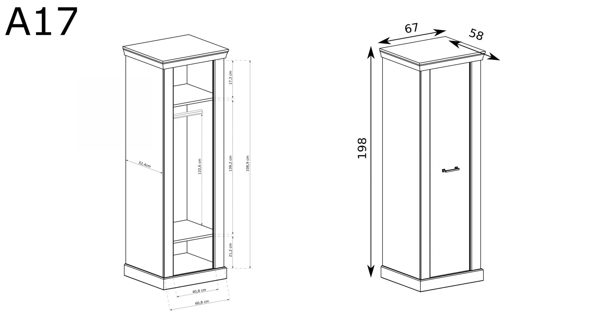 Jednoduchá šatní skříň s jedními dveřmi z kolekce Antica. Je vybavena závěsnou tyčí, která vám umožní využít dostupný prostor zavěšením oblečení na ramínka. Skříň má také dvě police, které umožňují pokládat věci naplocho. Její originální design překvapí mnoho hostů. Systém tlumeného dovírání dodává šatní skříni nádech elegance a tepla. Kovová rukojeť se bezproblémově začleňuje do celkového designu. K dispozici v barvě kraft gold.