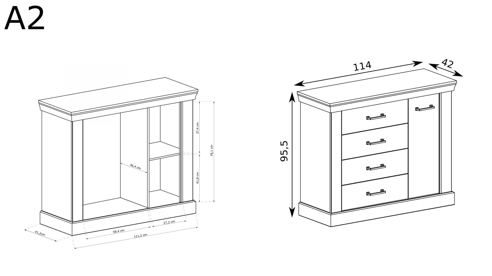 Tato komoda má čtyři prostorné zásuvky o šířce 59,6 cm a skříňku s jednou policí. Vejde se do ní široké oblečení, doplňky a dokumenty. Díky svému designu je organizace hračka. Tato komoda si najde své místo v obývacím pokoji, ložnici nebo dokonce jídelně a její design a jedinečný styl dokonale doplní každou místnost. Kovové úchytky dokonale doplňují konstrukci a vzhled nábytku. Další výhodou této komody je mechanismus tlumeného zavírání. K dispozici v povrchové úpravě řemeslné zlato.
