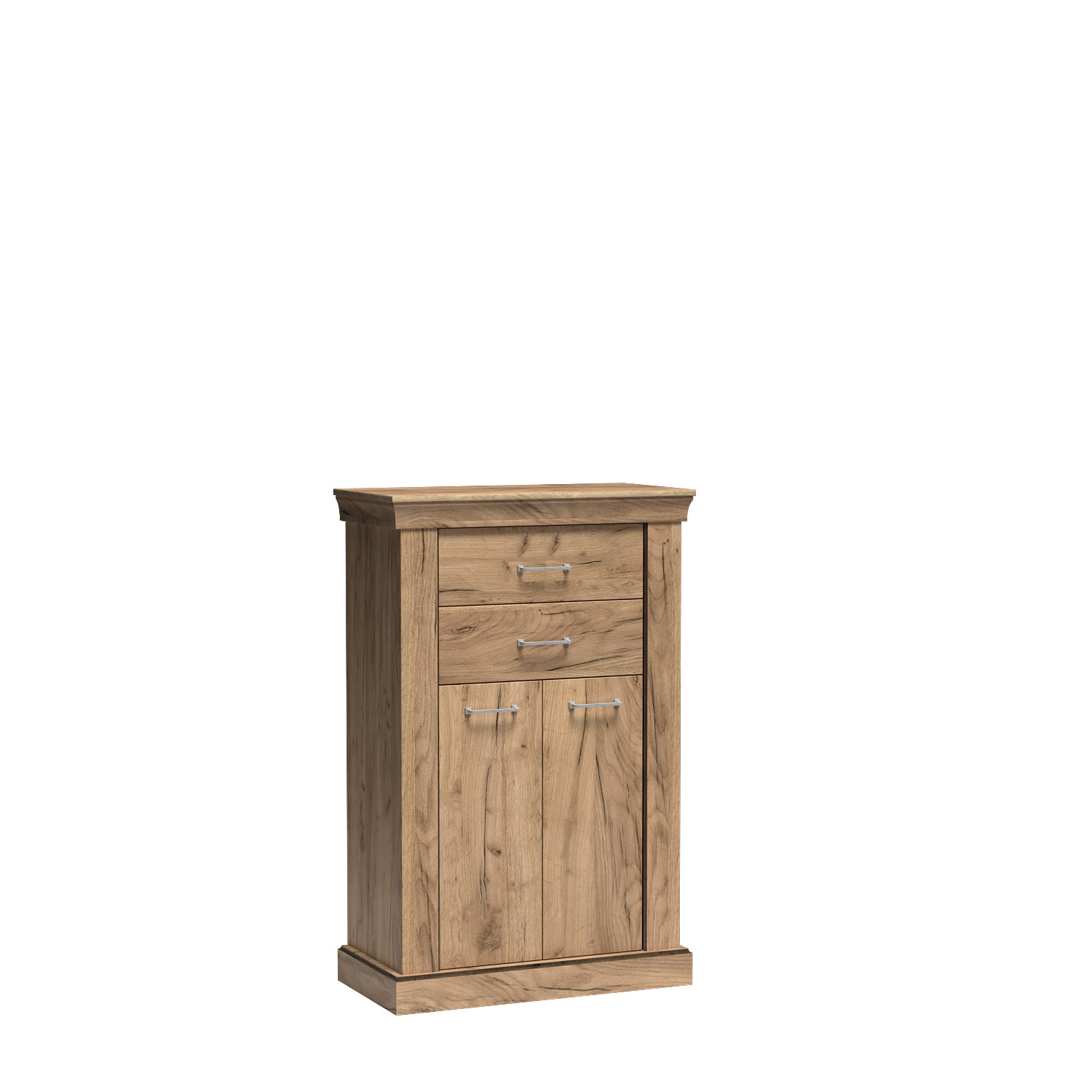 Úzká komoda, která se dokonale hodí do ložnice, obývacího pokoje nebo pokoje pro hosty. Skříňka má dvě zásuvky, ideální pro uložení dokumentů, doplňků nebo oblečení. Spodní část skříněk je rozdělena dvěma policemi, což umožňuje efektivní organizaci. Kovové úchytky dokonale doplňují design nábytku. Skříňky jsou vybaveny mechanismem tlumeného zavírání, který dodává nábytku jemný vzhled. K dispozici v řemeslně zlaté povrchové úpravě.