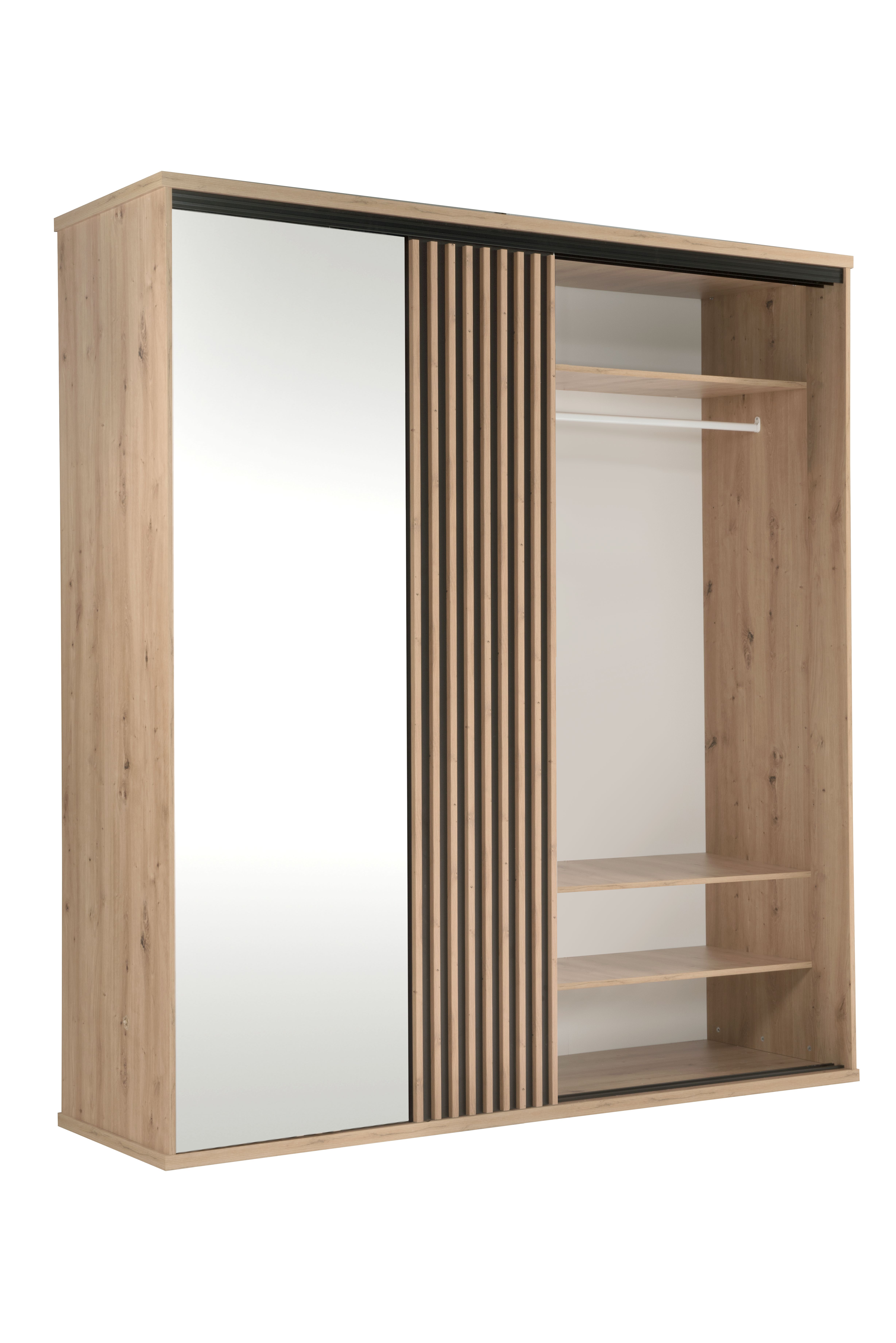 Pokud hledáte moderní posuvnou šatní skříň, která kombinuje funkčnost s jedinečným, lehce loftovým vzhledem, máme pro vás přesně to pravé. Harmonie a rovnováhy je dosaženo kombinací přírodního odstínu Artisan s černými akcenty a lamelovou vložkou. Velké zrcadlo na přední straně opticky zvětšuje prostor. Abychom se přizpůsobili malým i velkým prostorům, vytvořili jsme dvě velikosti šatních skříní: 179 cm a 199 cm. Všechny kusy kolekce Cali se vyznačují nejkvalitnějšími materiály a solidním zpracováním.