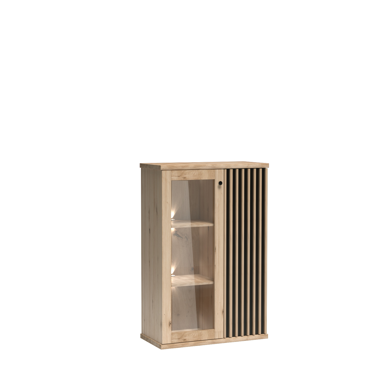 Vitrína se skleněnými dvířky je elegantním řešením pro jídelny a obývací pokoje. Může sloužit k uložení porcelánu nebo jako bar na vaše oblíbené nápoje či sladkosti. Vitrína není vysoká, ale díky vestavěným policím na pravé straně se do ní vejde řada předmětů. Doplnění nábytku o černou barvu vytváří zajímavý kontrast s lamelami.
