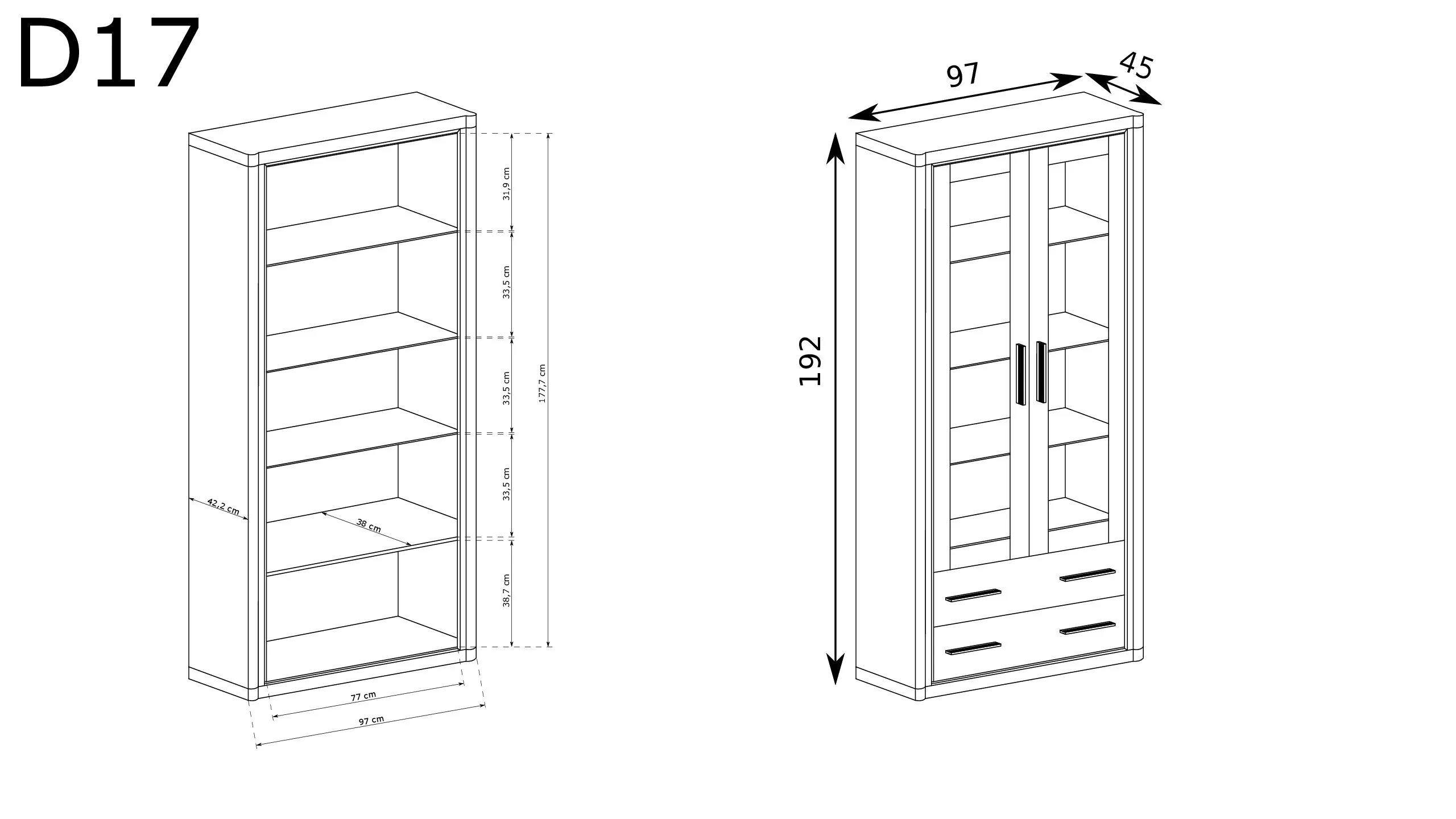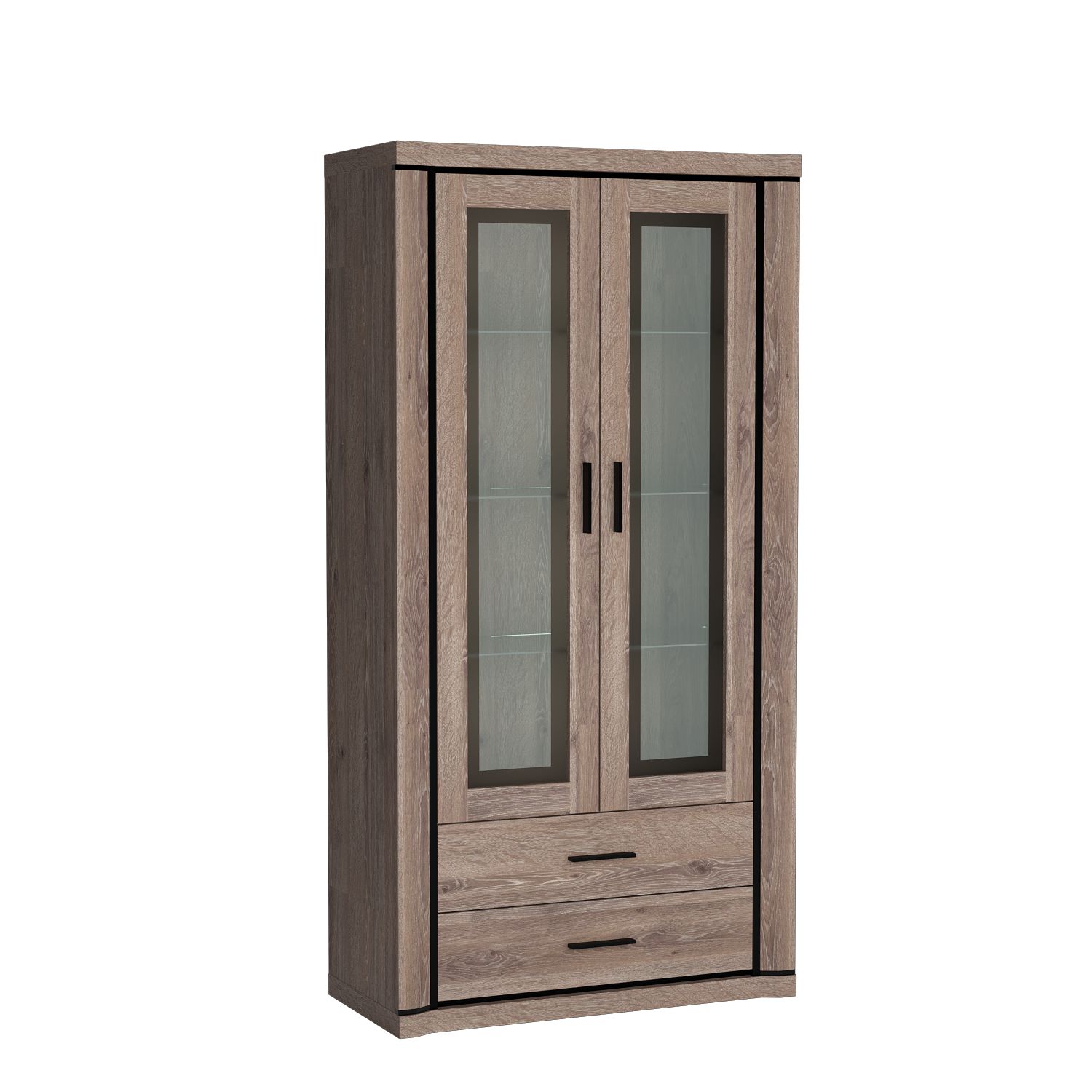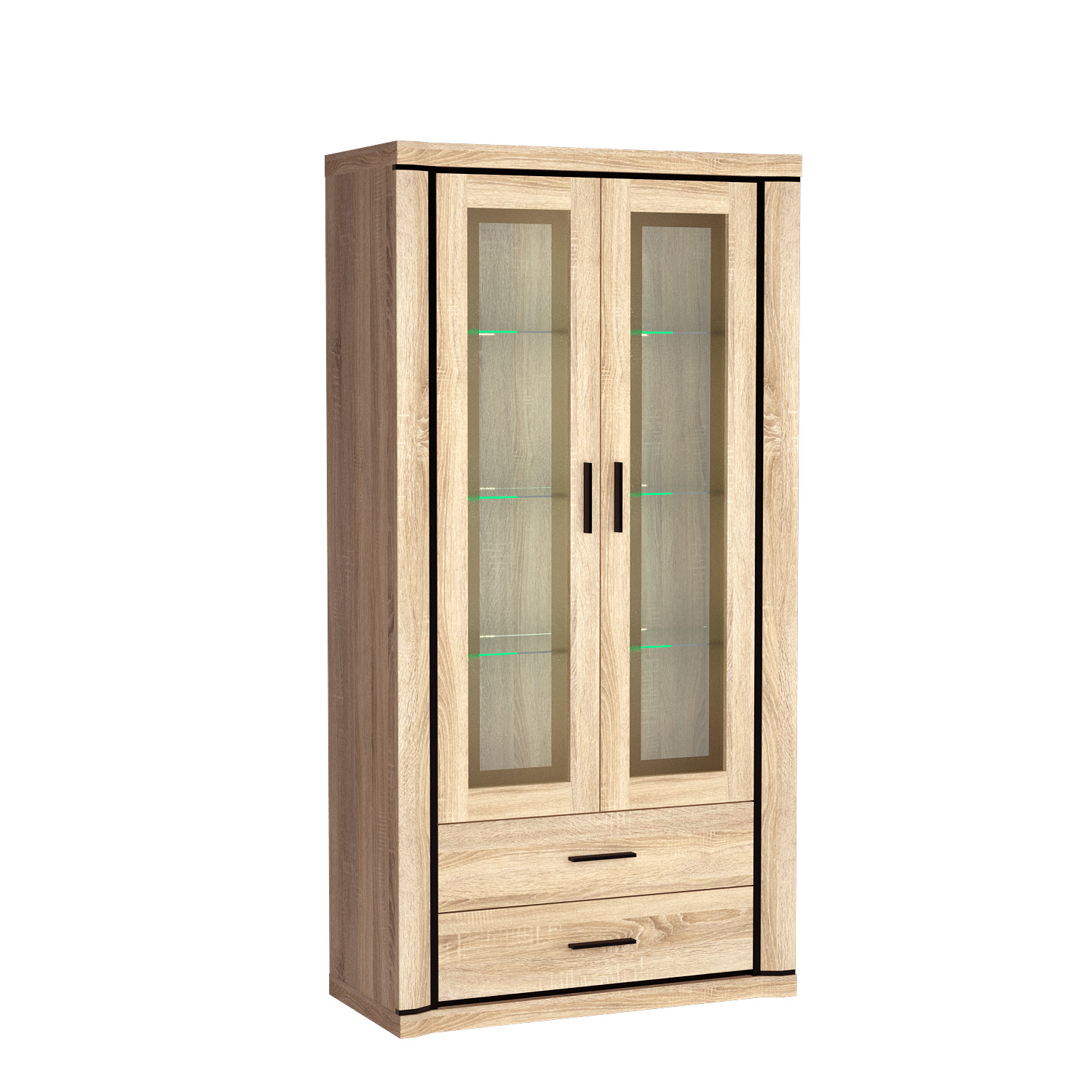 Díky jednoduchému designu a širokému výběru barev se tato vitrína snadno hodí do každé místnosti a dodá jí eleganci a charakter. Laminovaná deska o tloušťce 48 mm je vynikající volbou pro zajištění bezpečnosti vitríny. Uvnitř najdete tři krásné skleněné police, ideální pro vystavení vašich předmětů. Dvě zásuvky jsou stejně funkční. Vitrína se vyznačuje krásnými a originálními černými lamelovými rámy a kovovými úchyty, které vypadají úžasně a přitahují pozornost. K dispozici ve dvou barvách.