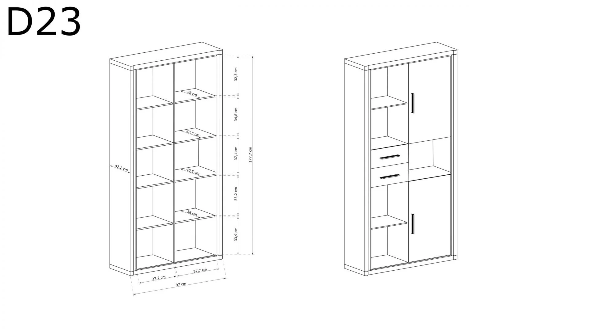 Tato prostorná a jedinečná knihovna z kolekce Dallas má pět polic (plus jednu v každé skříňce), dvě zásuvky a dvě skříňky. Nabízí mnoho možností úložného prostoru. Kovové úchytky dokonale doplňují ozdobné černé lamely. Tento kus se pyšní jedinečným designem, který jistě upoutá pozornost každého, kdo ho uvidí. Aranžmá s touto knihovnou budou zaručeně jedinečná. K dispozici ve dvou barevných provedeních.