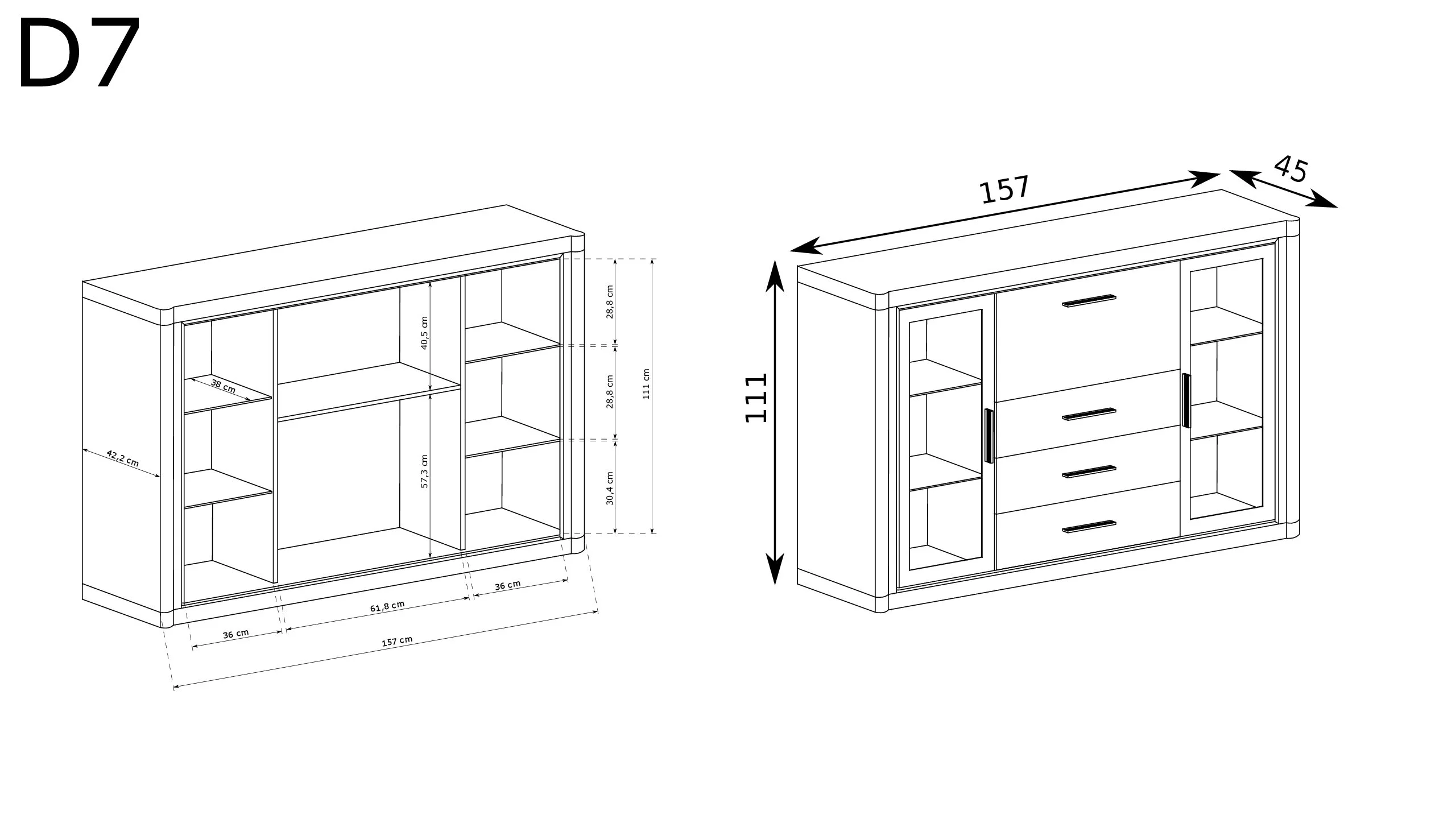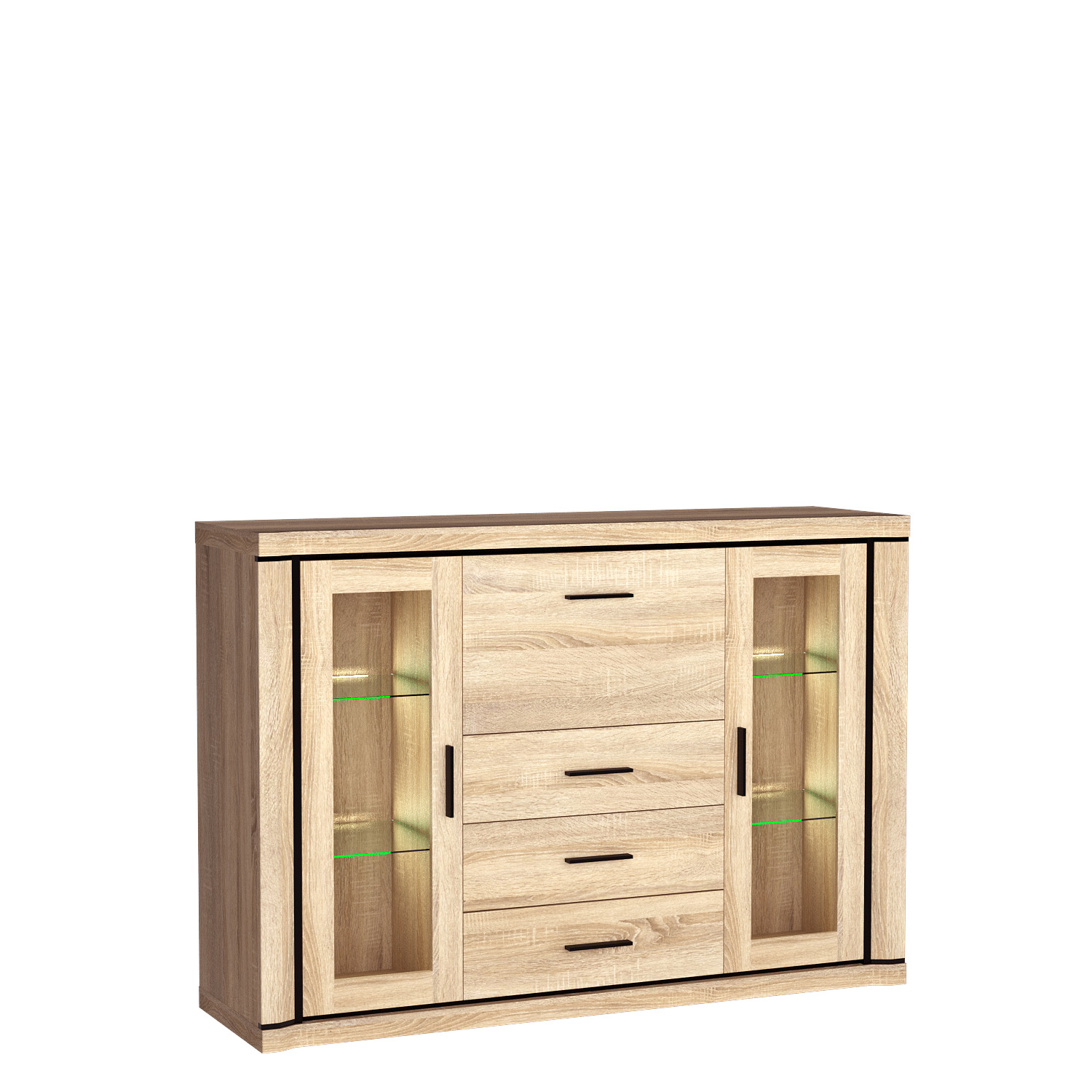 Tato jedinečně navržená komoda z kolekce Dallas se skládá ze tří zásuvek, výsuvné tyče a dvou prosklených skříněk, z nichž každá má dvě prosklené police. Vitrína nabízí řadu možností organizace, pojme různé oblečení, doplňky a dokumenty a je ideální pro vystavení vašeho oblíbeného porcelánu, suvenýrů nebo ozdob. Je vybavena černými lamelovými vložkami, které v kombinaci s kovovými úchyty vytvářejí jedinečný vzhled. Tato komoda se bude skvěle vyjímat v každém domě, bytě nebo kanceláři. K dispozici ve dvou barevných provedeních.
