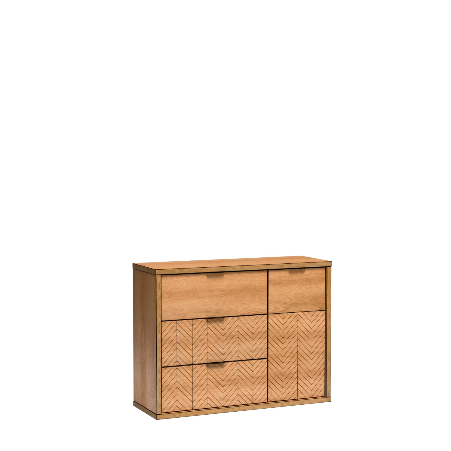 Funkční komoda z kolekce FONTI. Navzdory menší velikosti pojme spoustu věcí! Na levé straně najdete tři prostorné zásuvky na oblečení, spodní prádlo a drobnosti, zatímco na pravé straně dělí prostor napůl skříňka s policí. K dispozici v karamelovém dubovém provedení.