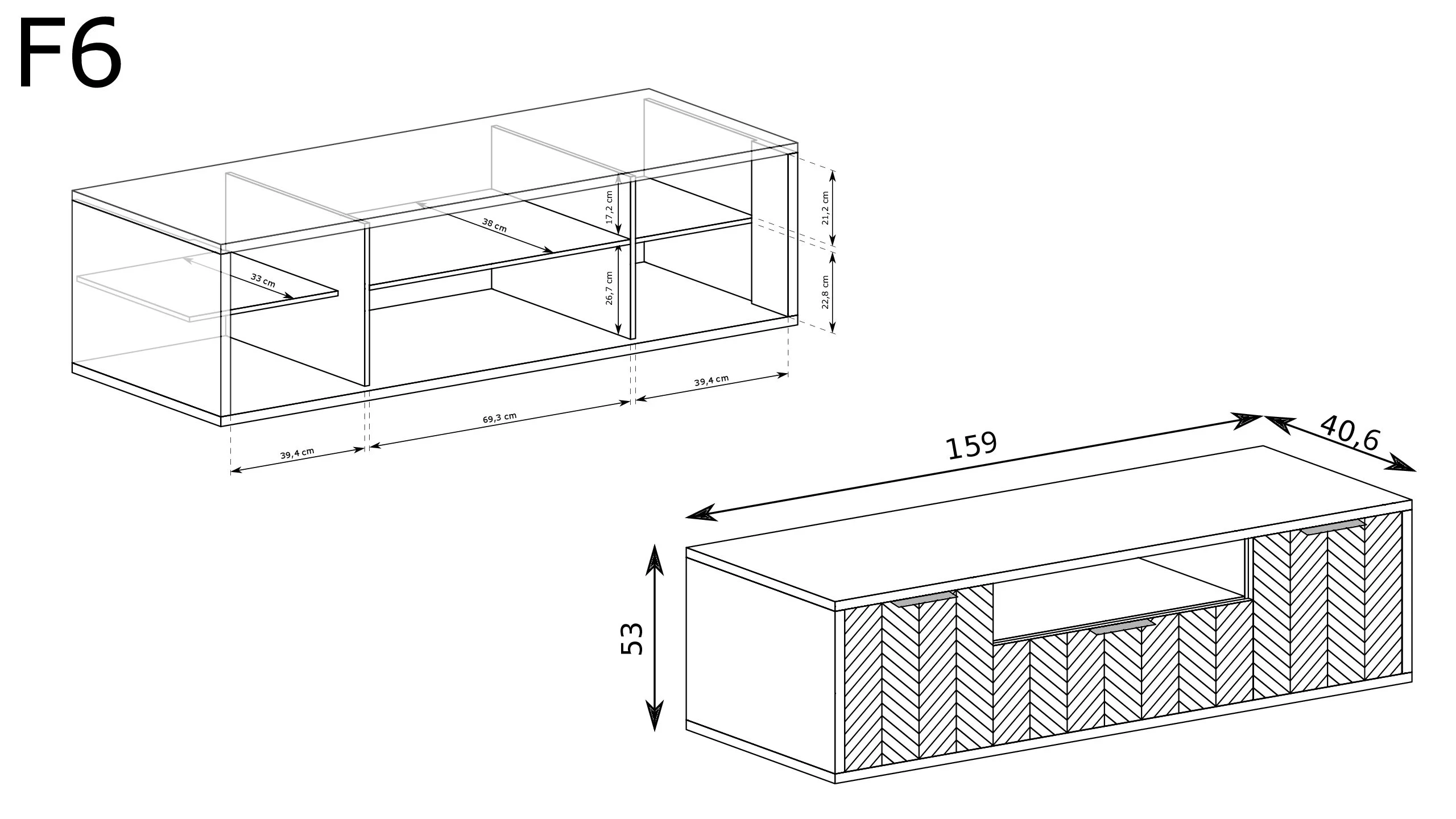 Klasický televizní stolek z kolekce FONTI s jednou centrální zásuvkou a policí nad ní na dekodér nebo jiné zařízení. Boky stolku mají pevné čela s policemi na nejrůznější doplňky a drobnosti. K dispozici v karamelově dubové povrchové úpravě.
