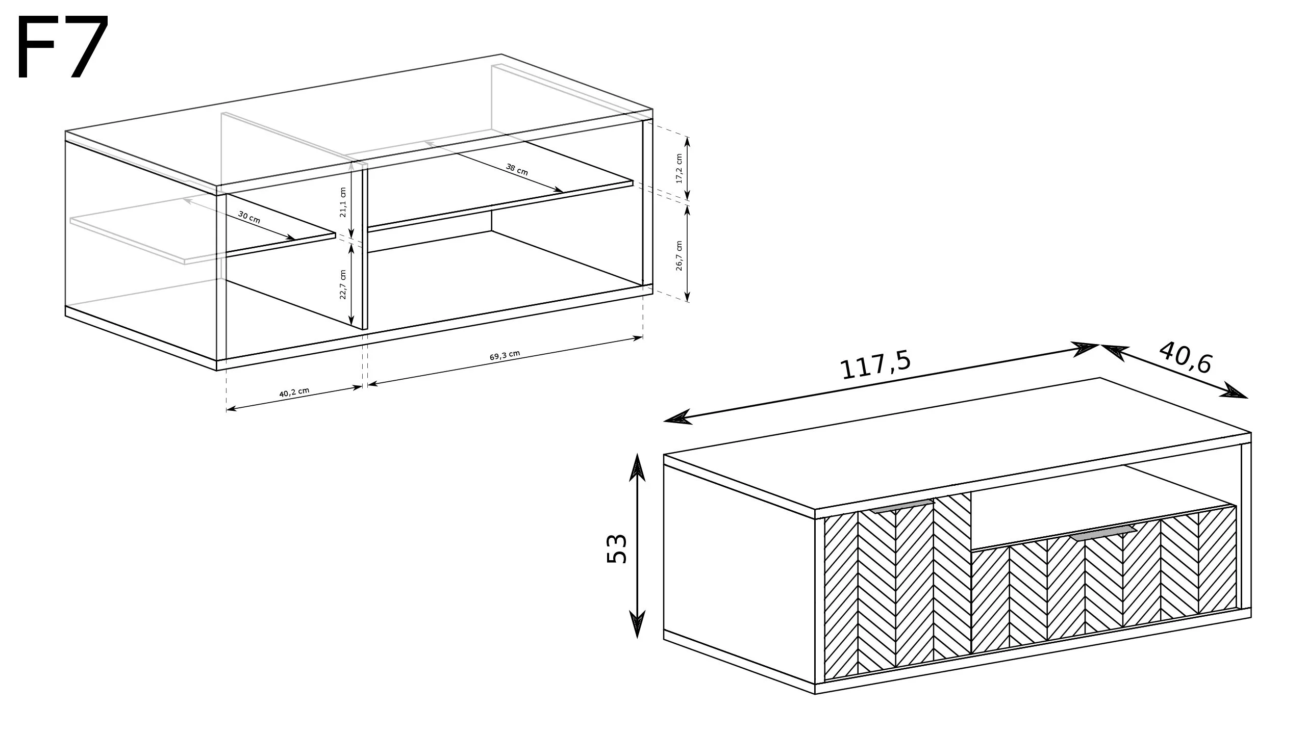 Menší televizní stolek z kolekce FONTI. Ideální do menšího obývacího pokoje. Na pravé straně je prostorná zásuvka s policí nad ní na televizní vybavení. Na levé straně je skříňka s plným čelem a policí, která rozděluje prostor na dvě části. K dispozici v karamelovém dubu.