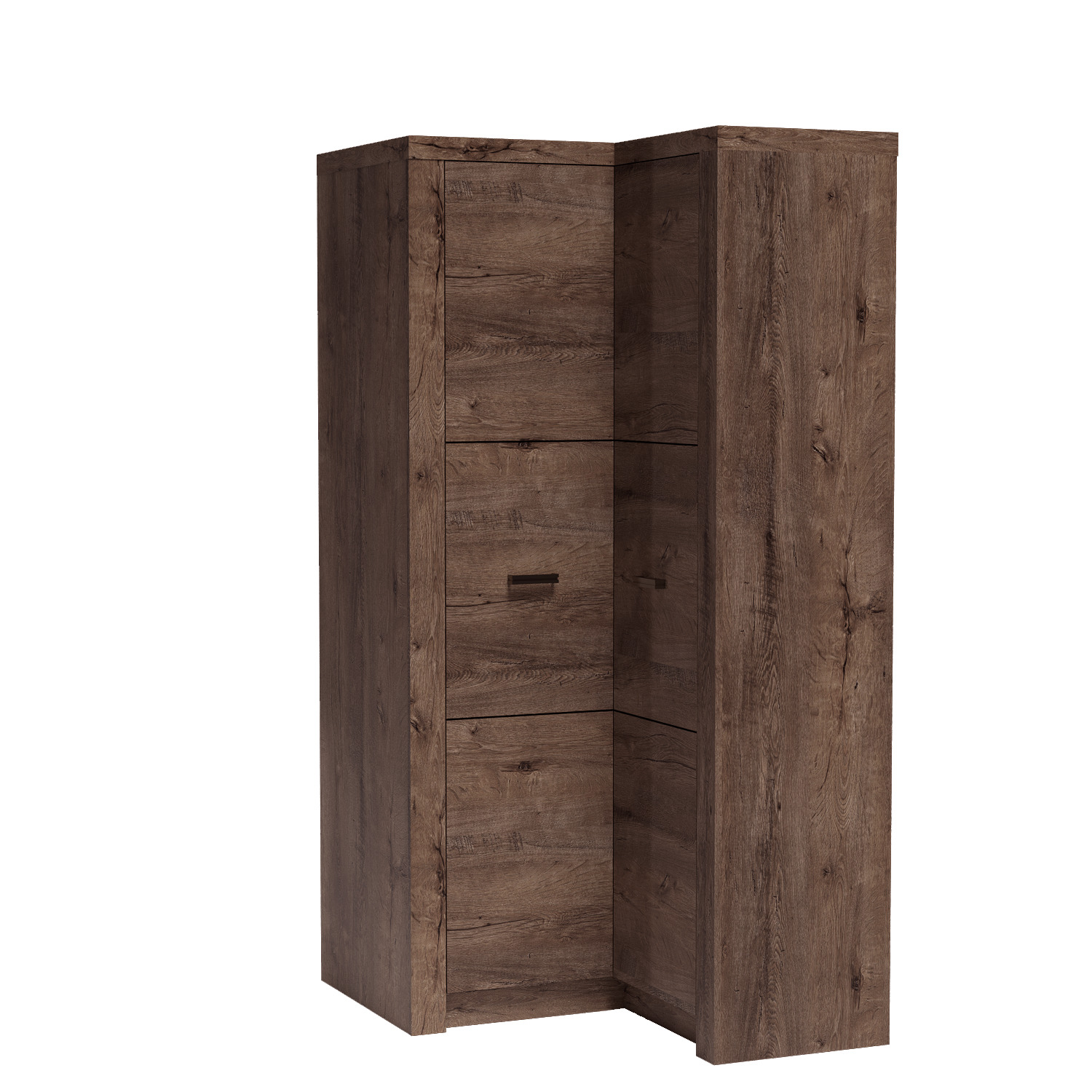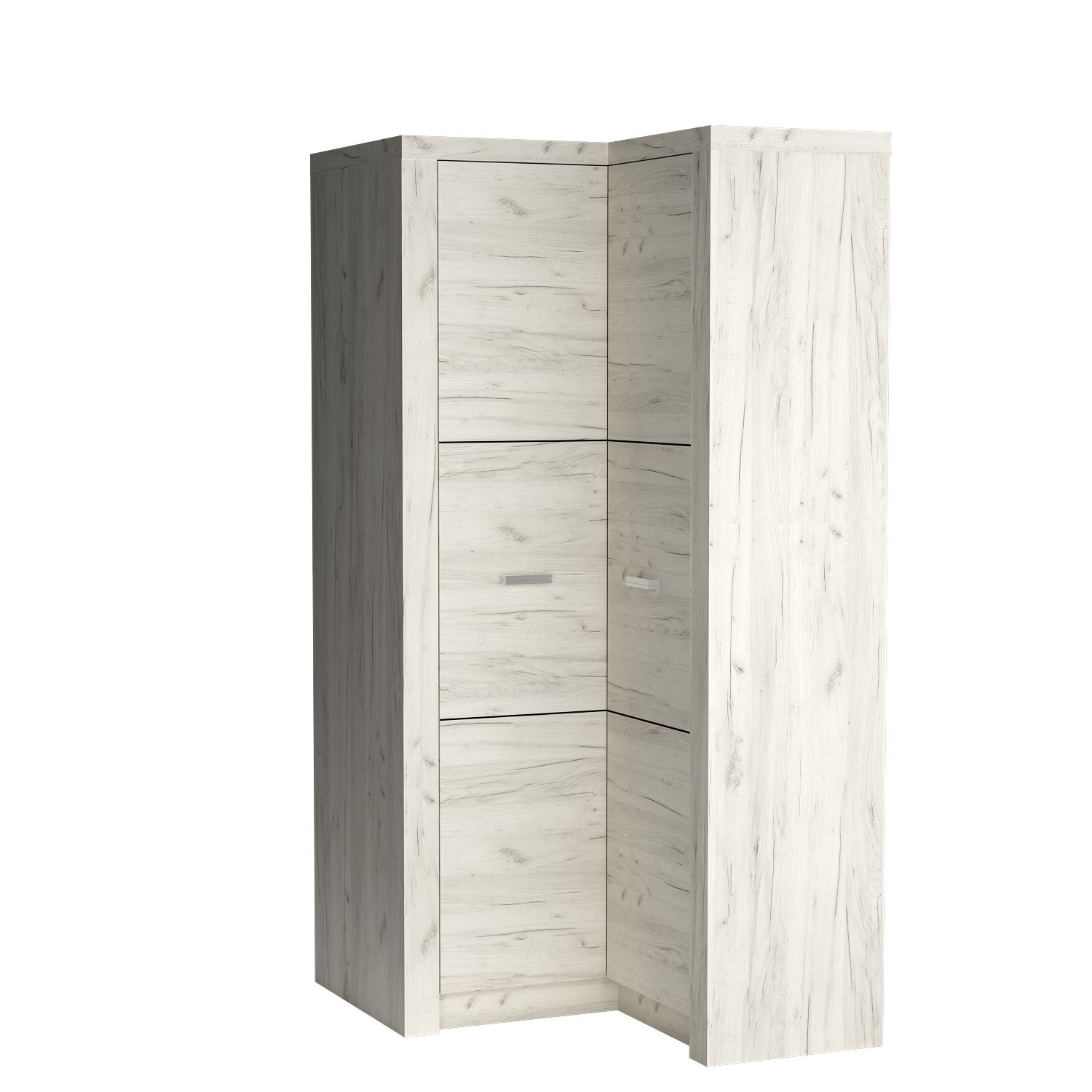 Rohová šatní skříň z kolekce Indianapolis. Tento kus je velmi prostorný, což umožňuje snadnou organizaci a přizpůsobení. Levá strana má jednu poličku a závěsnou tyč, která vám umožní vyplnit prostor pod ní. Pravá strana šatní skříně má čtyři police, ideální pro uložení složeného oblečení. Skříň se perfektně hodí do každého rohu a dodá místnosti teplo a kouzlo. K dispozici je varianta se třemi policemi, které lze přidat na levou stranu. Kovové úchyty zvýrazňují nábytek. K dispozici je také možnost obráceného umístění. K dispozici ve třech barvách.