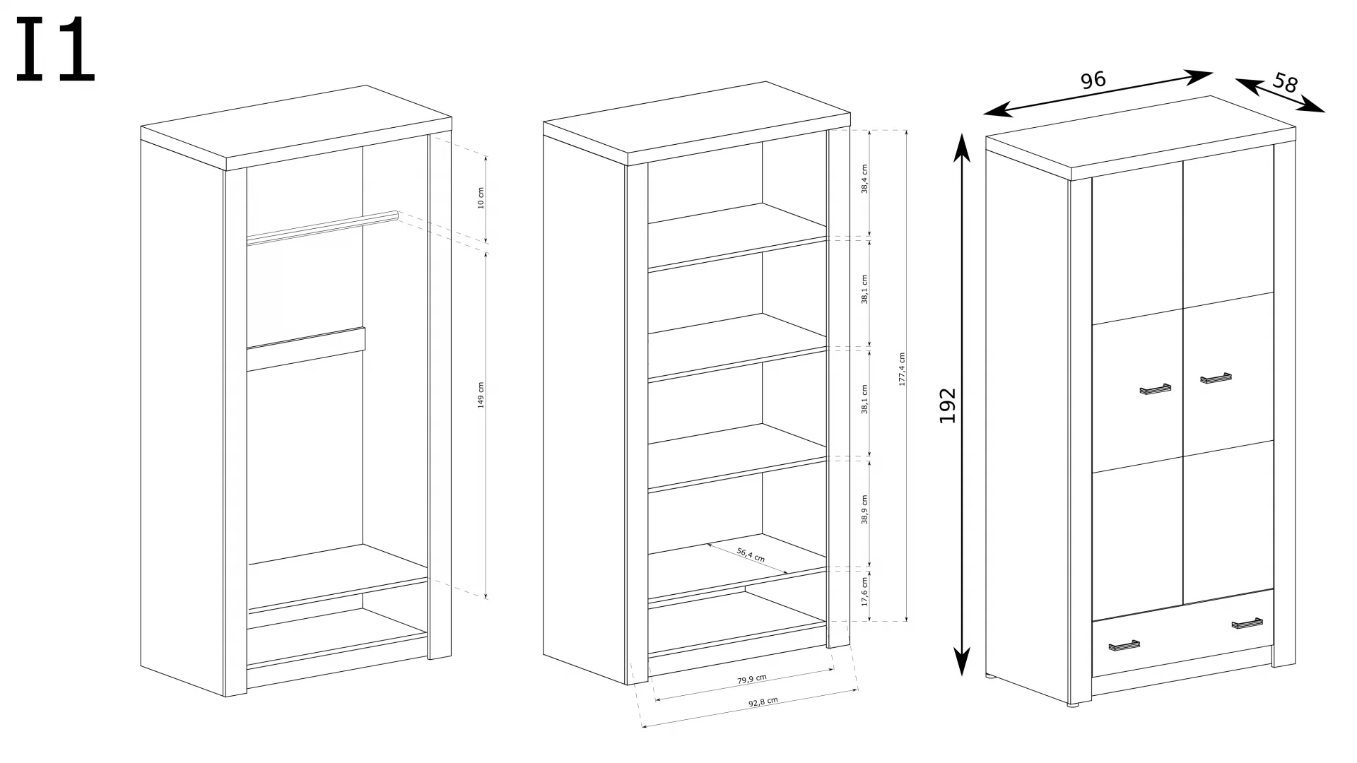 Jednoduchá, velká dvoudveřová šatní skříň s kovovými úchyty. Součástí je zásuvka o hloubce 58 cm. Součástí skříně je také tyč o délce 92 cm, která je ideální pro využití dostupného prostoru, zavěšení oblečení a udržení pořádku. Tato skříň jistě zaplní prázdný prostor ve vaší domácnosti, vytvoří mnoho zajímavých aranžmá a překvapí hosty svým jedinečným designem. K dispozici ve třech barvách.