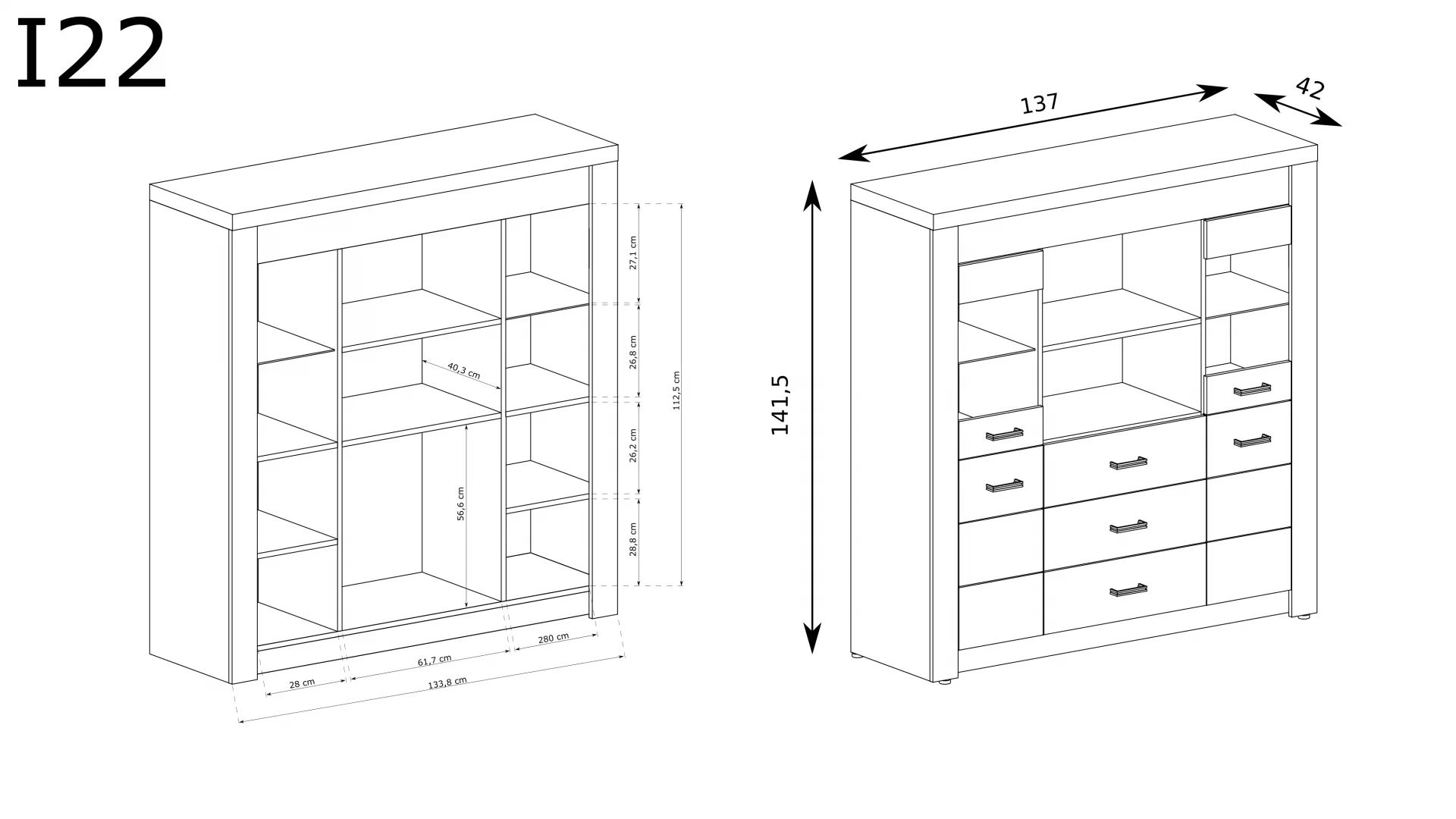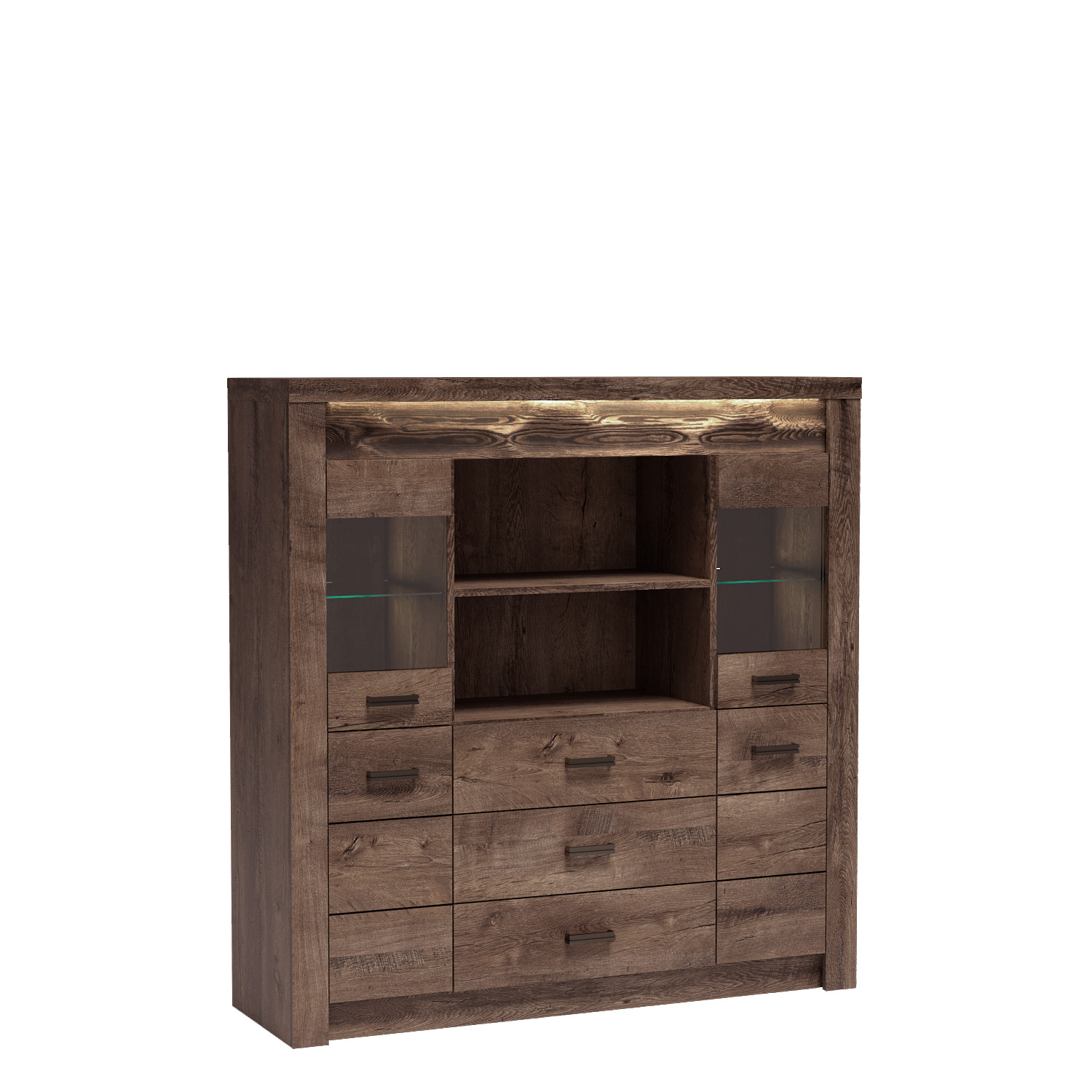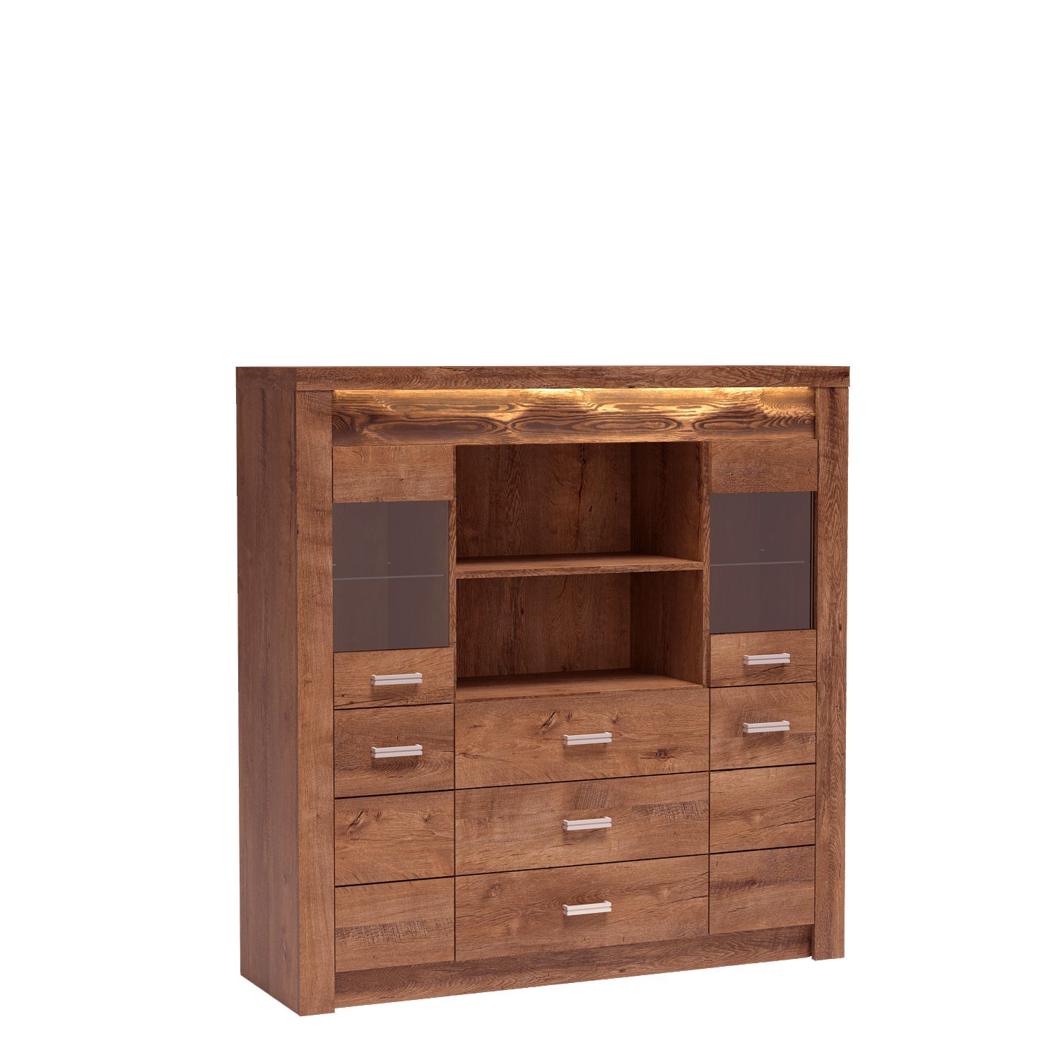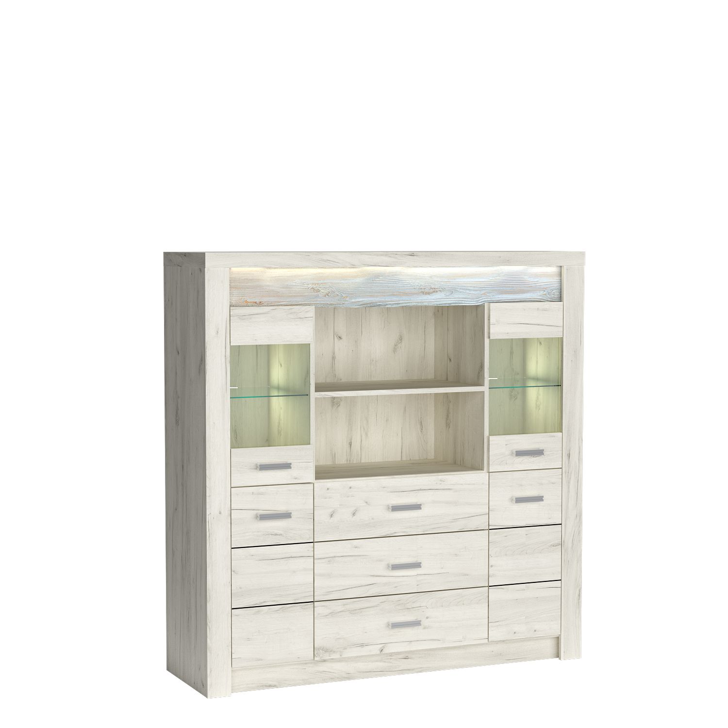 Velká komoda, která se bude skvěle vyjímat ve vaší domácnosti. Disponuje třemi prostornými zásuvkami a pěti policemi, ideálními pro uložení ozdob, suvenýrů, porcelánových souprav, drobností a dalších věcí. Skleněné čela dodávají místnosti nádech originality a atmosféru. K dispozici je také varianta s plnými čelami. Komoda je vyrobena z tlustých, vysoce kvalitních laminovaných desek a má kovové úchyty, které zdůrazňují robustnost kusu. K dispozici ve třech barvách.