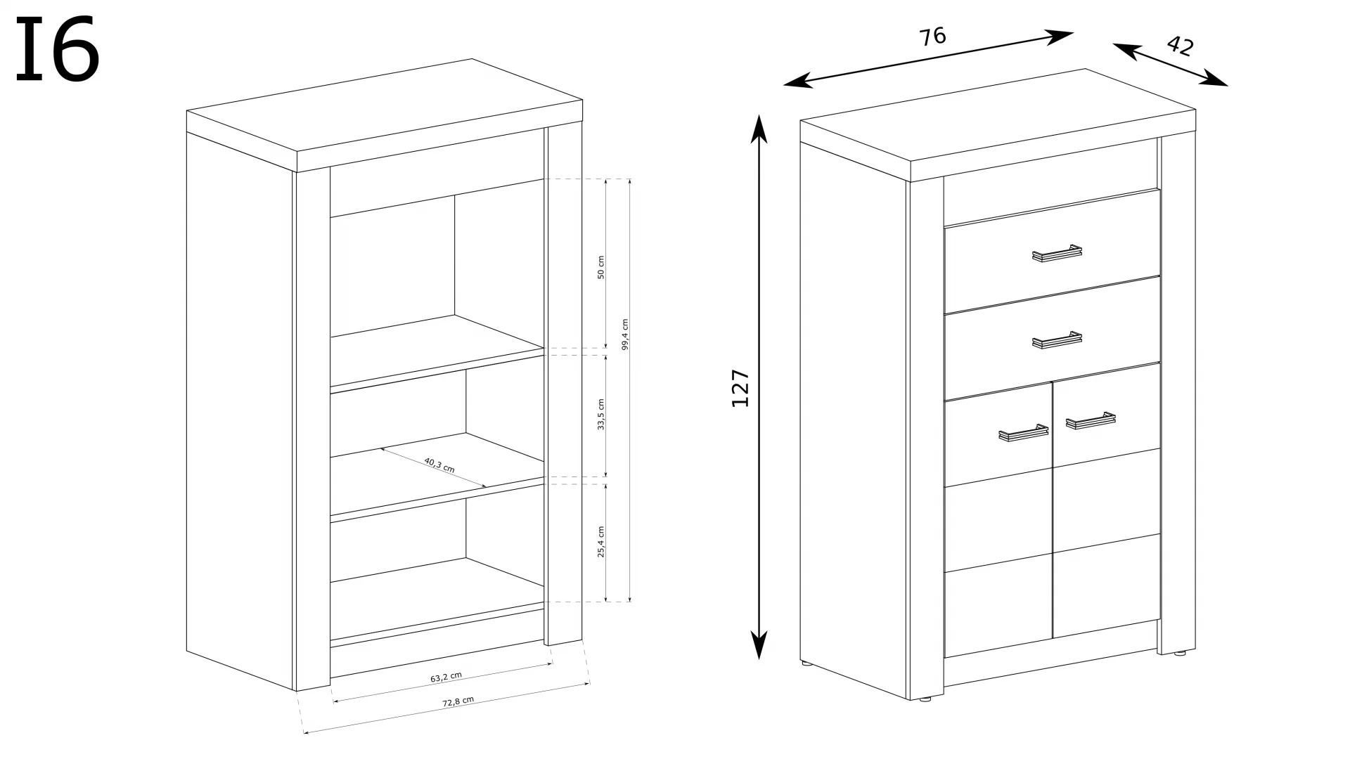 Tato komoda o výšce 127 cm má dvoukřídlé dveře s úložnou policí, která prostor dělí na polovinu, což umožňuje 100% využití prostoru. Komoda má dvě zásuvky, každá se otevírá krásnými kovovými úchyty. Volitelná LED horní deska dále umocňuje vzhled komoda. K dispozici ve třech barvách.
