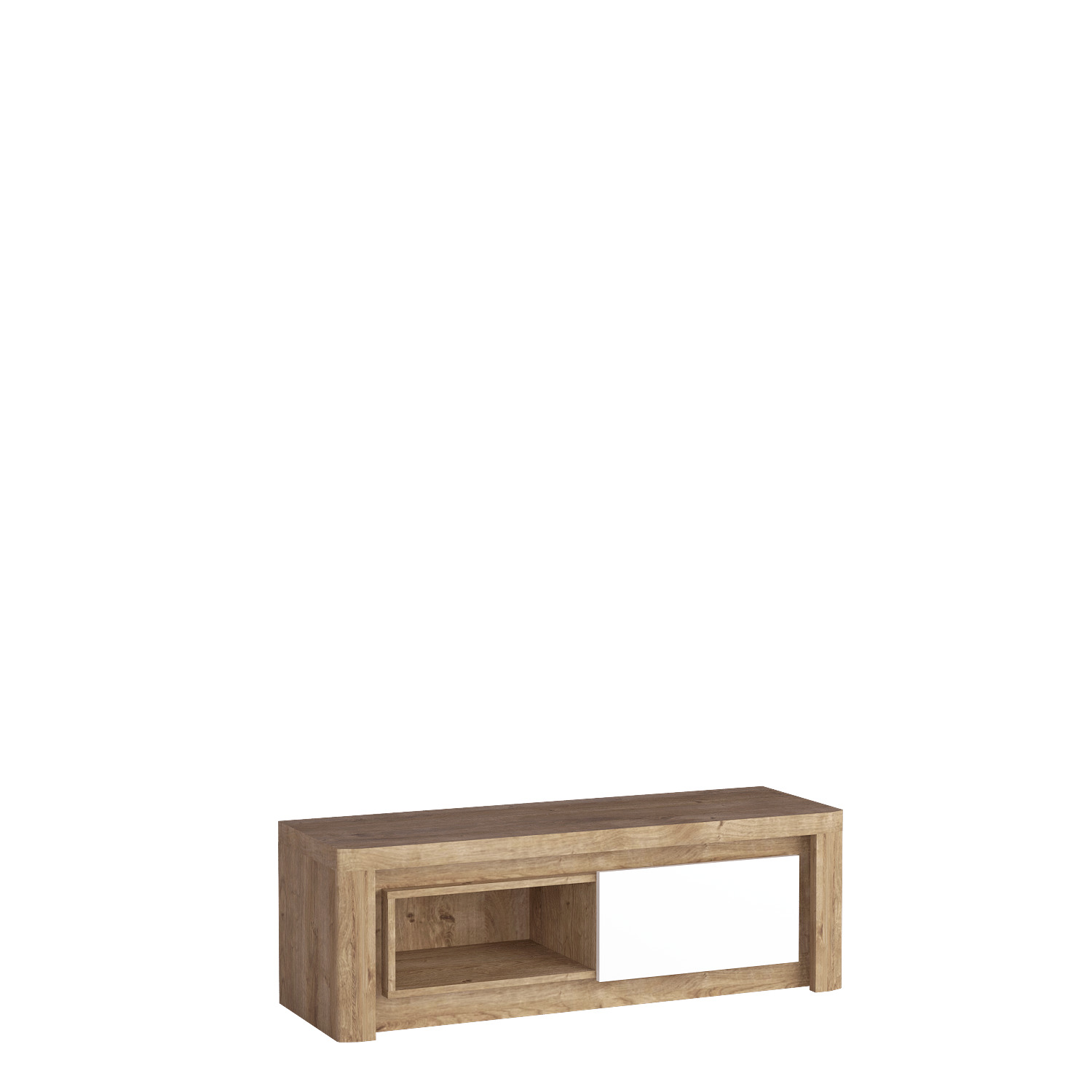 Malý televizní stolek, ideální do bytu s omezeným prostorem. Moderní a krásně přírodní, kombinuje dřevo Ribbeck s lesklými bílými čelami a vytváří tak ohromující efekt. Je to perfektní kus nábytku do obývacího pokoje. Nabízí úložný prostor za bílou klopou vpravo a také poličku na satelitní přijímač. Dodané osvětlení lze také nainstalovat tak, aby osvětlovalo horní i boční strany stolku.