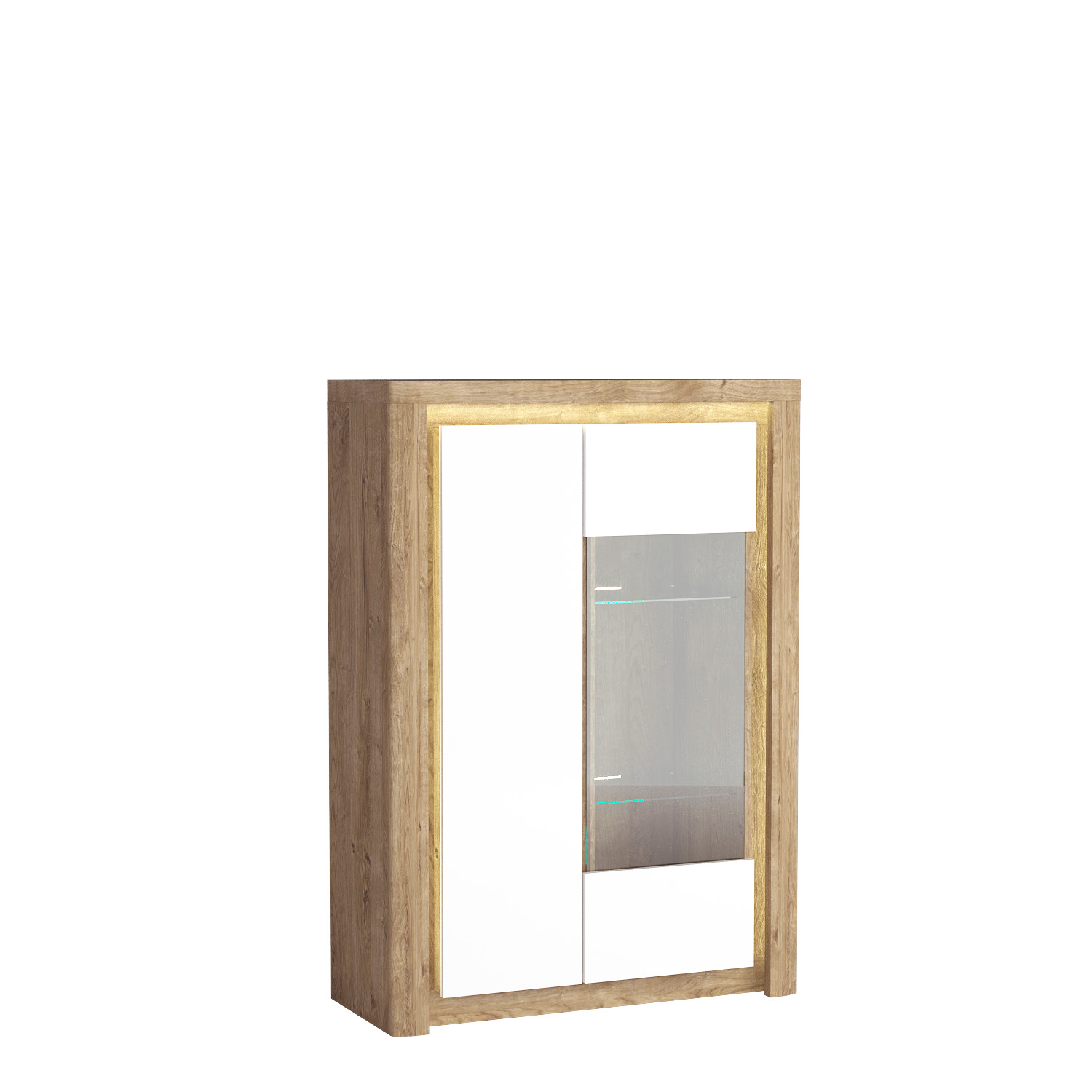 Skleněná vitrína v barvě Ribbeck s lesklými bílými dvířky. Vitrína je rozdělena na dvě části. Na pravé straně najdete dveře s bezpečnostním tvrzeným sklem a uvnitř dvě skleněné police, které lze osvětlit LED diodami. Na levé straně je šatní skříň s plnými dveřmi z laminované desky. Uvnitř najdete dvě police. Vitrína má panty s tlumeným zavíráním. Tato vitrína se perfektně hodí do obývacího pokoje nebo jídelny, vedle další komody ze stejné kolekce.