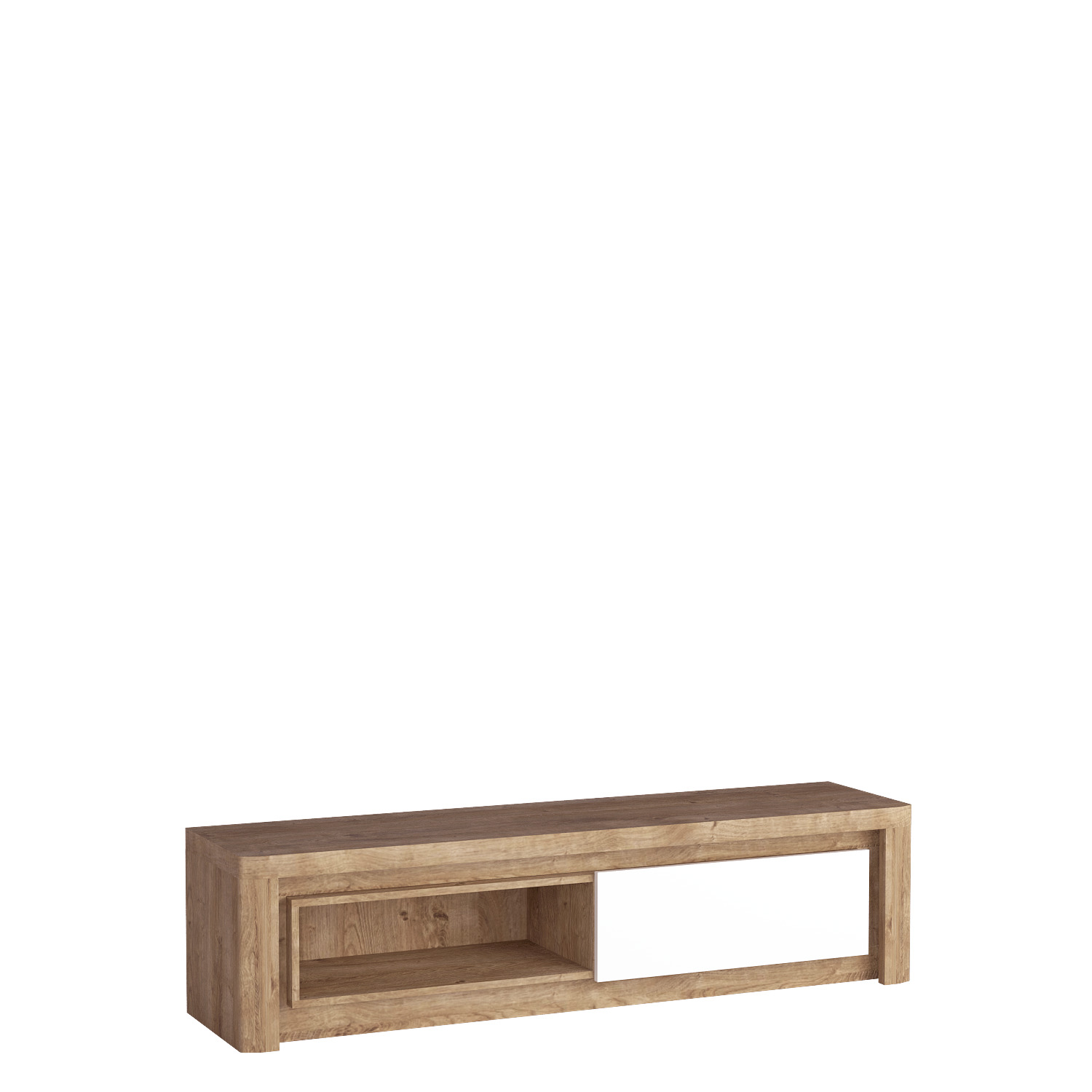 Velký, moderní televizní stolek. Přírodní barva korpusu a čelních stěn doplní jakýkoli interiér. Na pravé straně stolku se nachází uzamykatelná skříňka s výklopnou přední částí, která se otevírá dolů. Na levé straně je otevřená police, na kterou se vejde set-top box nebo hudební systém. Televizní kout v obývacím pokoji je místem, kde trávíme hodně času. Je důležité cítit se v relaxačním prostoru pohodlně. Osvětlení zabudované do stolku zpříjemní náš čas a snadno se používá i za soumraku. Stolek doplní ostatní prvky systému a vytvoří harmonický celek v krásných barvách.
