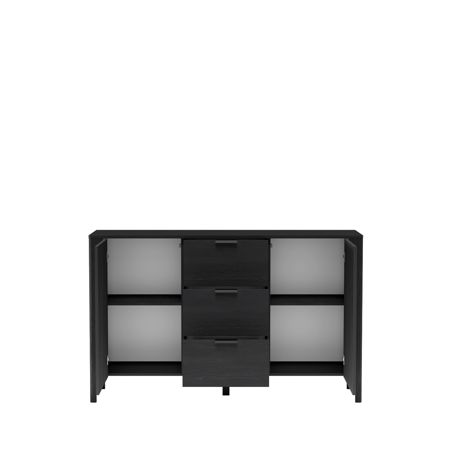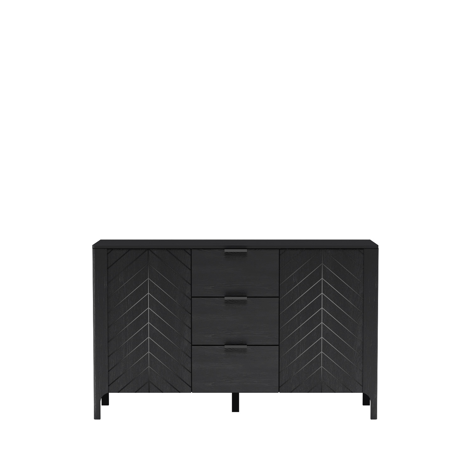 Tato moderní černá komoda se zásuvkami se vyznačuje elegantním vzorem rybí kosti. Má tři zásuvky a dvě skříňky s policemi, které nabízejí dostatek úložného prostoru. Štíhlé nohy dodávají komodě nádech lehkosti a odolné materiály zajišťují dlouhou životnost. Ideální do obývacích pokojů, ložnic a chodeb.