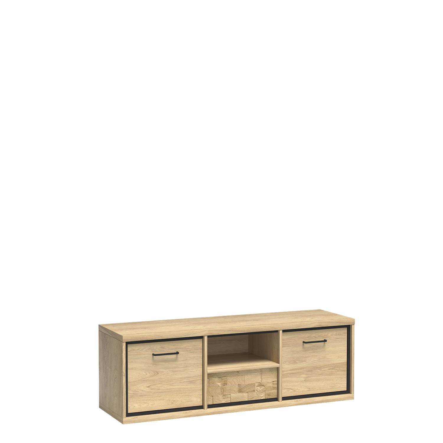 Moderní televizní stolek. Ideální do malých obývacích pokojů. Dvě boční skříňky ho činí vysoce funkčním a prostorným. Je vybaven policí a hlubokou zásuvkou na pevných výsuvech, které jsou ideální pro uložení různých předmětů. Do středu skříňky lze umístit televizní set-top box nebo konzoli. Tento televizní stolek dodá vaší televizní stěně nádech elegance. Představte si černou verandu s nástěnnou televizí uprostřed, stojanem na nožičkách pod ní a nejlepším zvukovým systémem po stranách. Dokonalé domácí kino! Tento televizní stolek je k dispozici v přírodním hikorovém provedení, inspirovaném loftovým stylem. Mezi další možnosti patří vysoké černé nohy a dekorativní LED osvětlení zásuvek.
