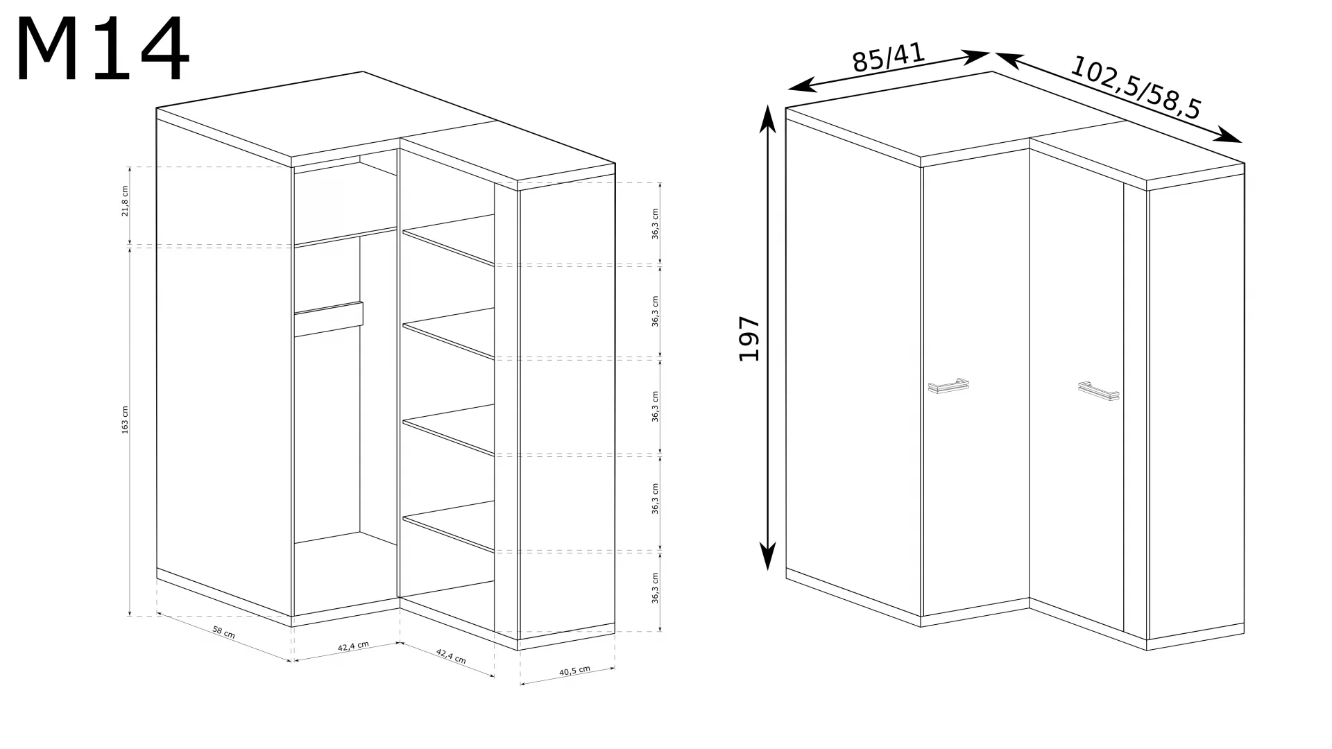Prostorná rohová dvoudveřová šatní skříň s úchyty pro uložení oblečení. Možnost přidání dalších polic umožňuje velkorysé množství prostoru. Vzácný prvek mezi šatními skříňmi. Interiér disponuje závěsnou tyčí a nad ní policí. Tato skříň je ideální pro vyplnění nevyužitého prostoru v místnosti. Přírodní barva dřeva a tmavé, dekorativní lišty ve stylu loftu dodávají interiéru teplo.