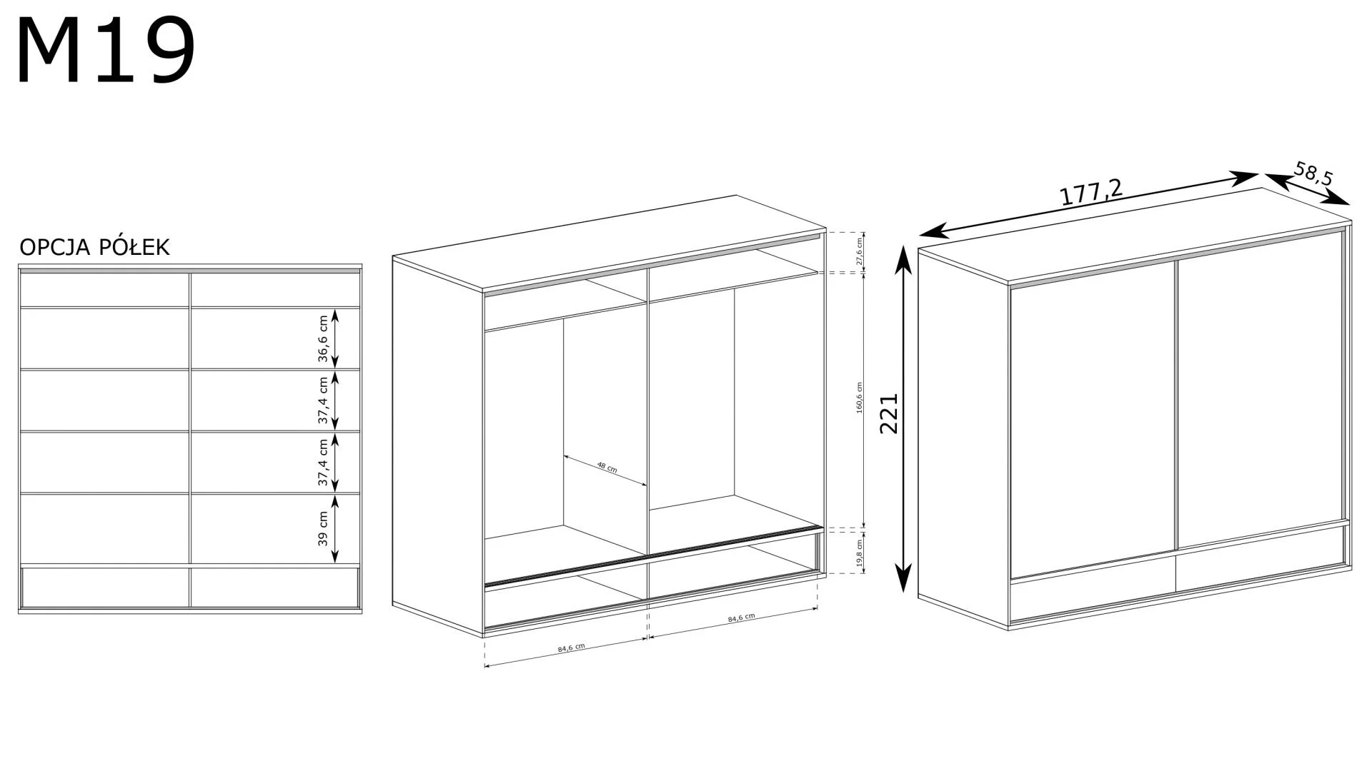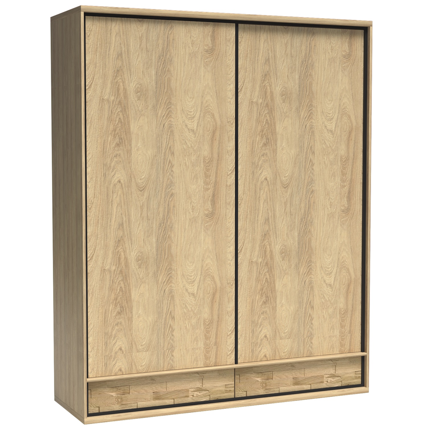 Jednoduchá, velká šatní skříň s posuvnými dveřmi pro uložení oblečení. Má krásné černé lamelové lišty. Teplá, světlá barva doplní jakýkoli interiér, ale tmavé akcenty jsou inspirovány loftovým stylem. Skříň má závěsnou tyč pro snadné zavěšení oblečení. Ve spodní části jsou dvě prostorné zásuvky, které se otevírají stisknutím tlačítka. Prostorné police usnadňují organizaci složených předmětů. Přední panel lze také vyměnit za dekorovaný dubový.