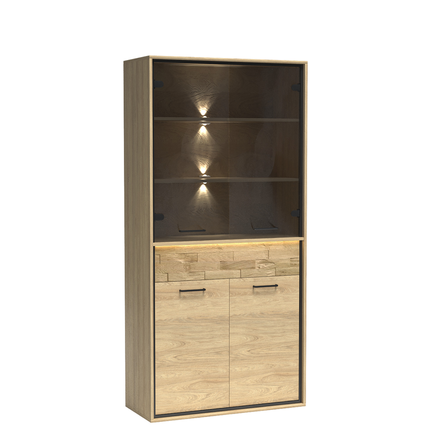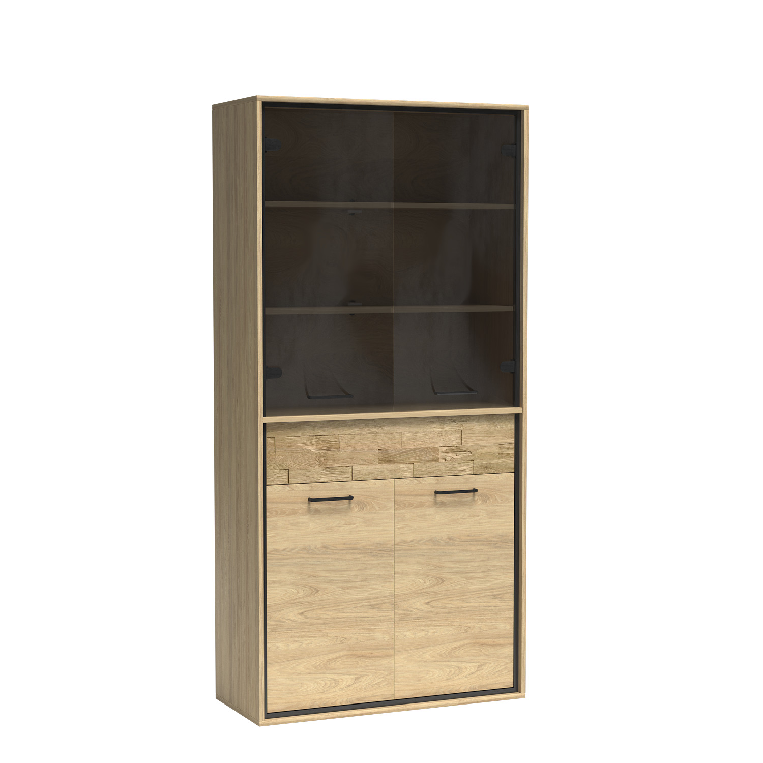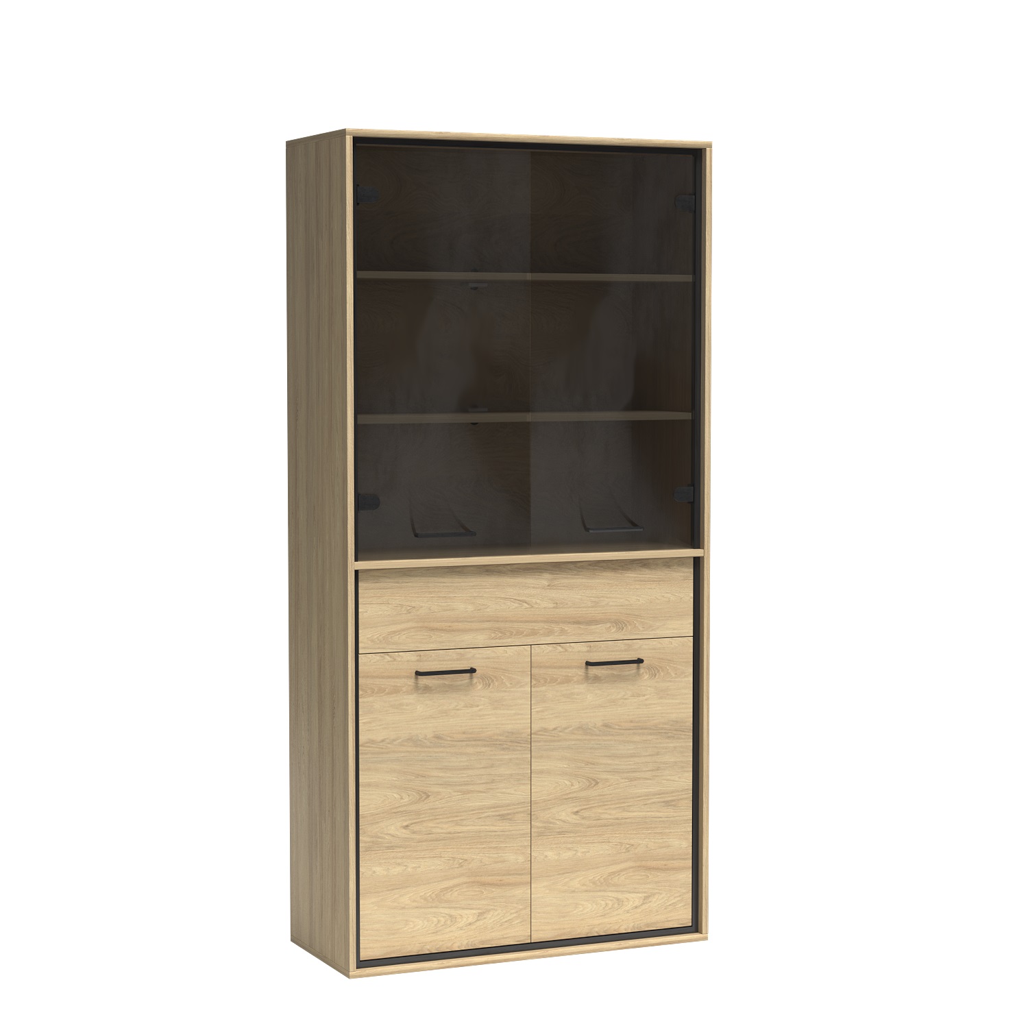 Přemýšlíte, jakým nábytkem si pořídit jídelnu? Vitrína z kolekce MILAN v barvě přírodního hikorového dřeva. Kombinuje dvoudveřovou skříňku ve spodní části se skleněnou vitrínou v horní části. Tento kus nábytku se perfektně hodí do místností, jako je jídelna, pracovna, obývací pokoj nebo rodinný pokoj. V jídelně bude dokonale vynikat vedle svátečního nádobí, pokud použijete osvětlené police. Vitrína doplňuje moderní industriální styl. Horní část vitríny má dvojitá čela z kouřového tvrzeného skla a dvě police z laminované desky. Spodní část má světlá čela s černými kovovými úchyty, za nimiž se nachází police. Nad spodní skříňkou se nachází výsuvná zásuvka, která se otevírá dotykem. Je vybavena moderním systémem otevírání push-to-open. Můžete přidat doplňky, jako jsou černé nohy, které budou ladit s černým lemováním, a vytvořit tak perfektní kombinaci. Čelo zásuvky lze ozdobit dubovou dřevěnou deskou. Pro lepší efekt můžeme použít LED osvětlení skleněných polic a dekorativní desky.