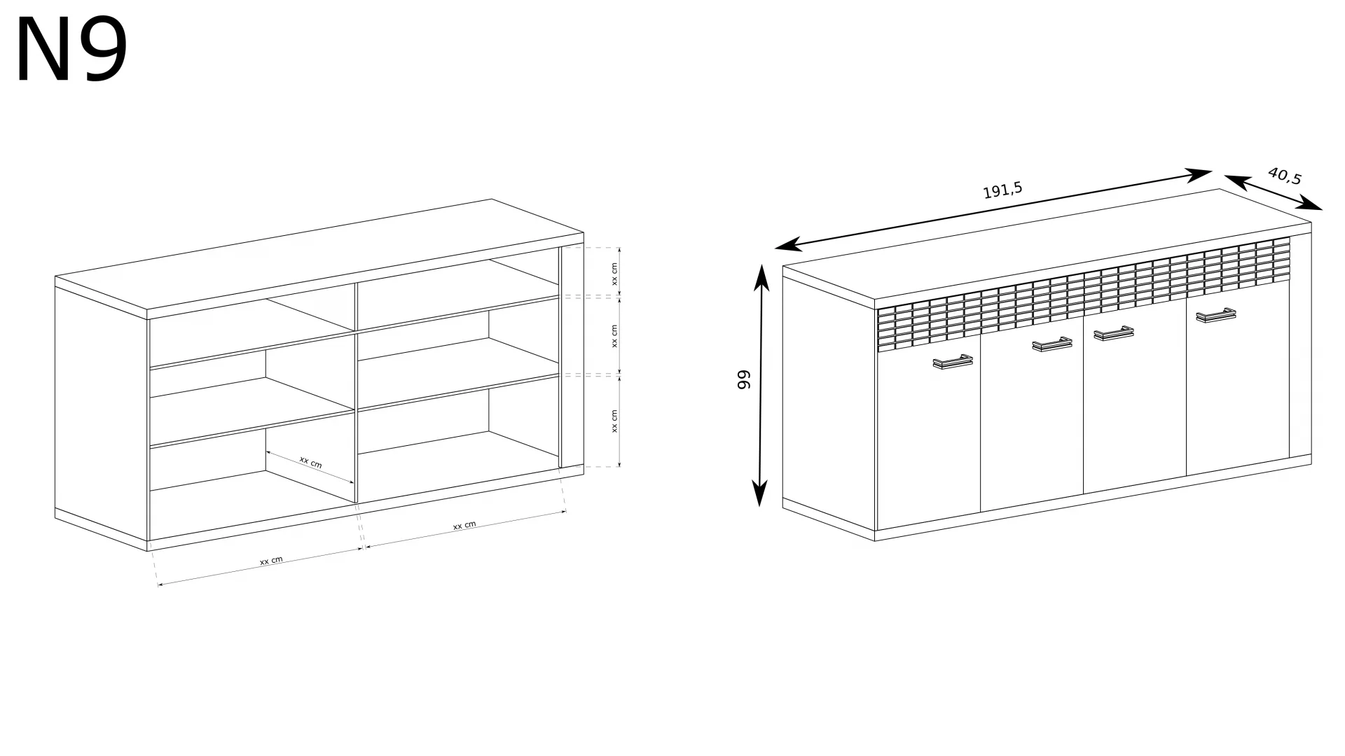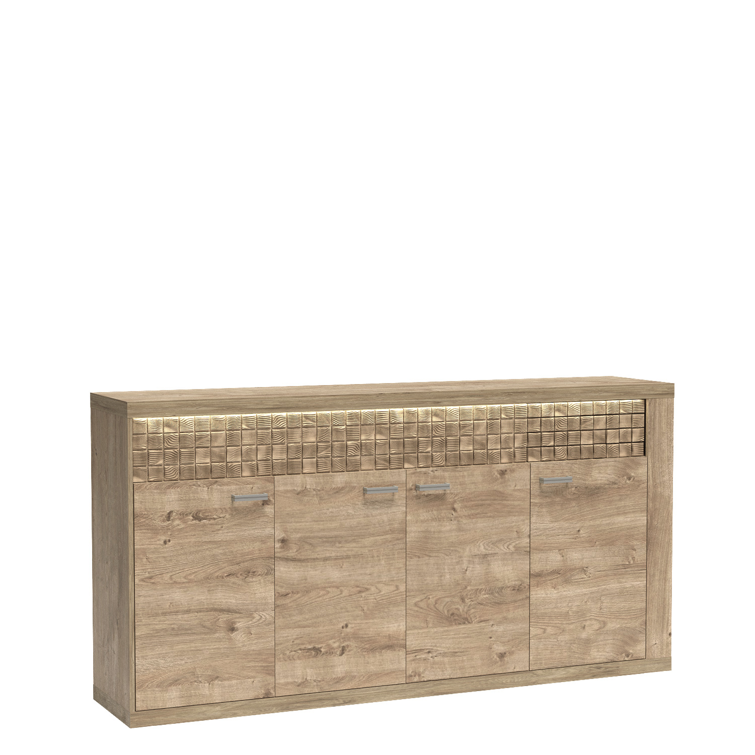 Velká komoda se čtyřmi skříňkami. Uvnitř dvě prostorné police a zásuvky s otevíracím systémem push-to-open nahoře. Tento kus nábytku pojme různé oblečení, doplňky a dokumenty. Perfektně se hodí do obývacího pokoje, kanceláře, chodby nebo pracovny. Přitáhne pozornost mnoha hostů. Komoda je vyrobena z pevného materiálu, díky čemuž je odolná a zaručuje mnoho let příjemného používání. Kovové úchytky a mechanismus tlumeného zavírání zdůrazňují jemný design a demonstrují důraz na nejmenší detaily. K dispozici v jedné barvě.