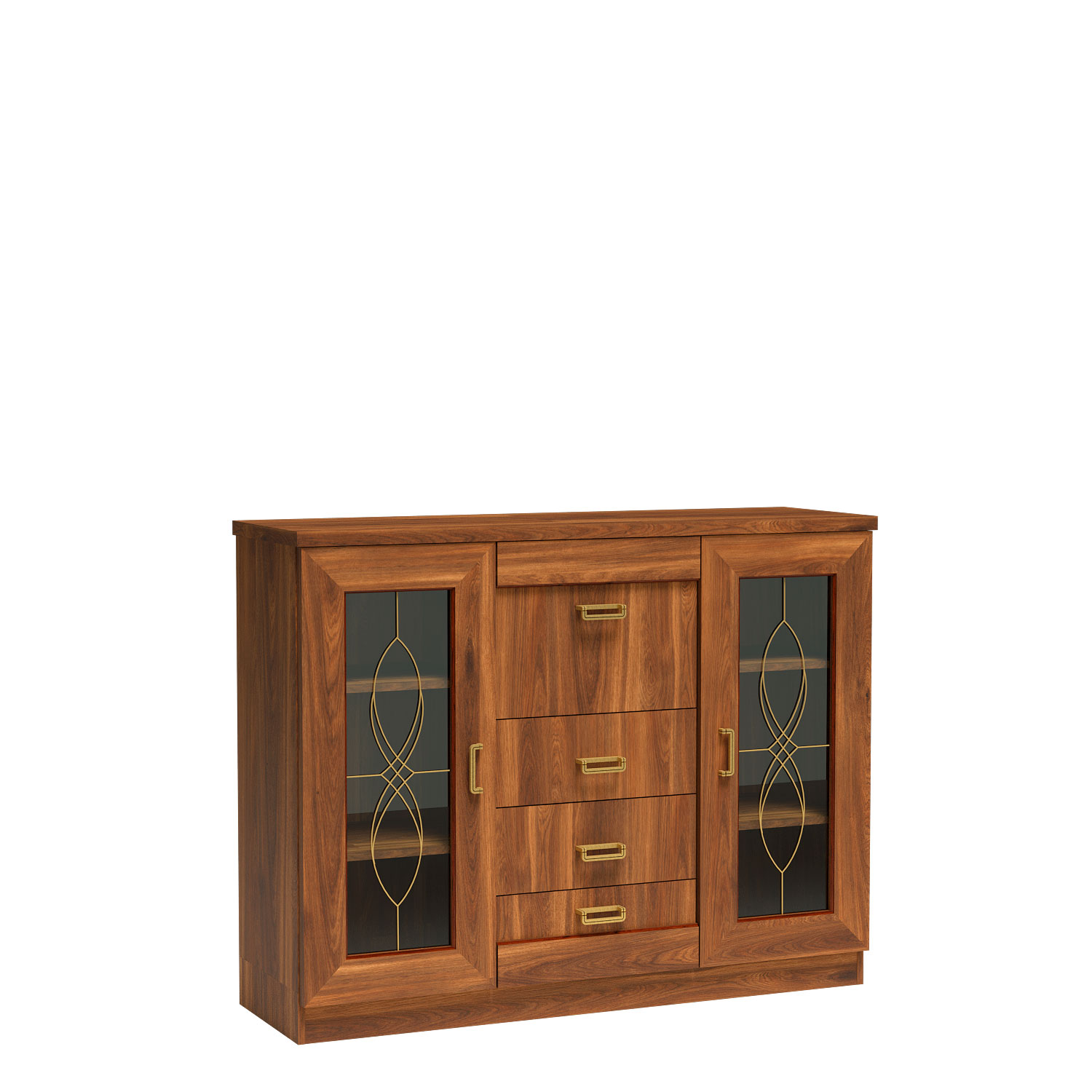 Tato vysoká komoda má bar a skleněná dvířka s elegantním vzorem. Je ideální do obývacího pokoje nebo jídelny. Je prostorná a elegantní a má tři zásuvky.