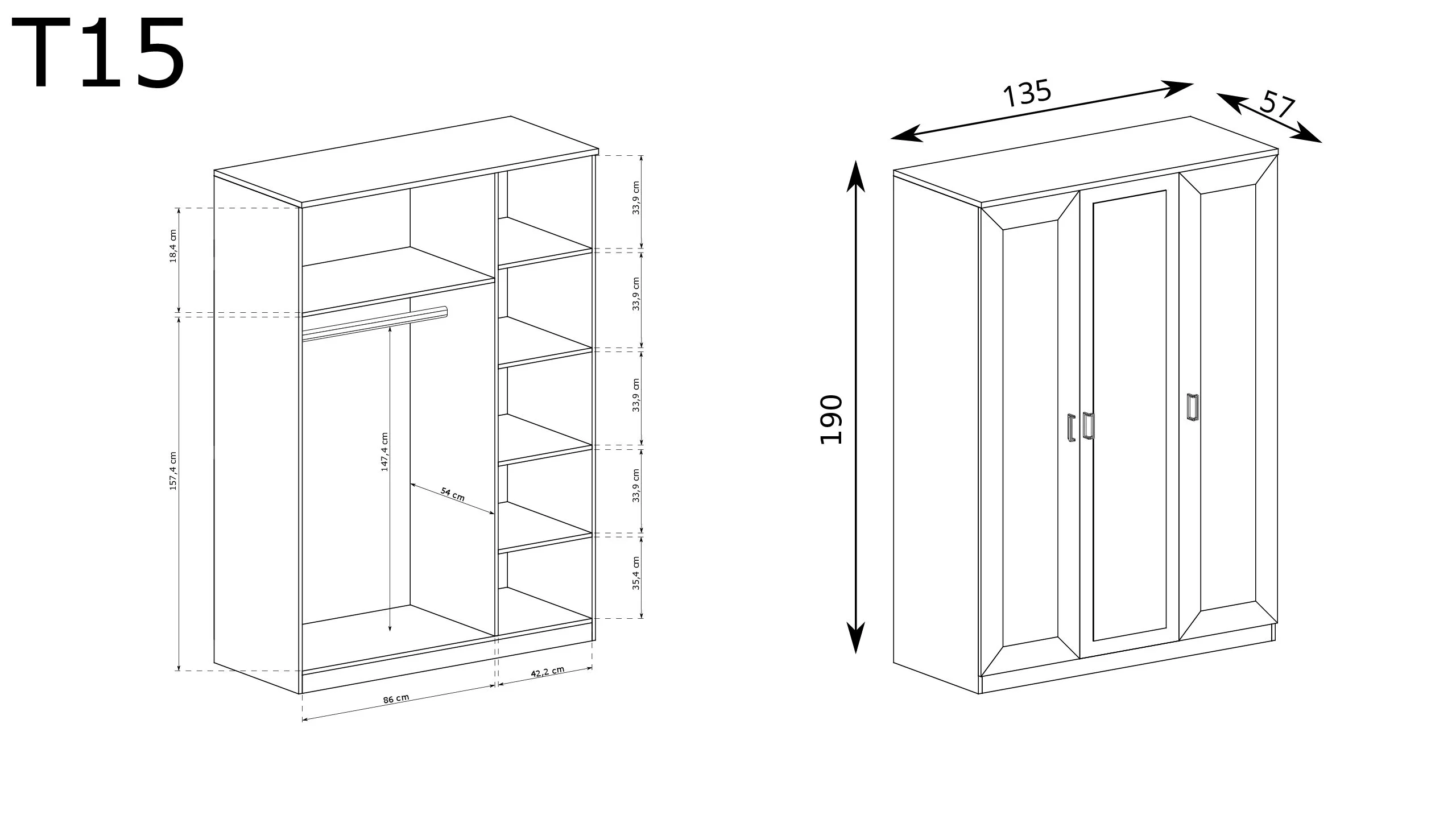 Velká třídveřová šatní skříň se zrcadlem, které opticky zvětšuje prostor. Na jedné straně je umístěna tyč na zavěšení oblečení. Nad ní je praktická police. Na druhé straně je police na složené předměty nebo ložní prádlo. Celá skříň se perfektně hodí do rustikálního stylu.