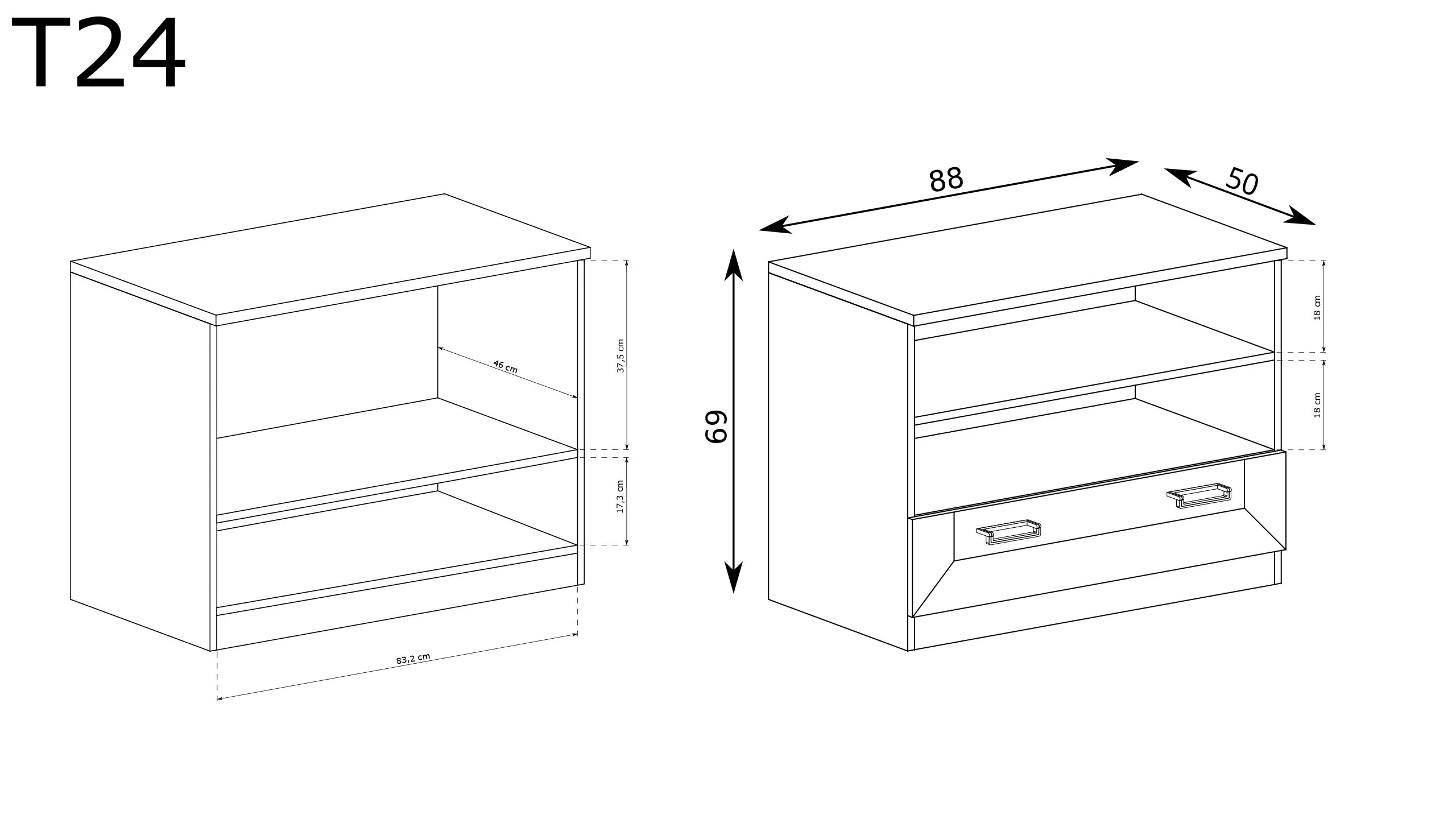 Malý televizní stolek na televizi. Obsahuje zásuvku na kabely a dvě police na dekodér nebo konzoli. S kovovými úchyty.
