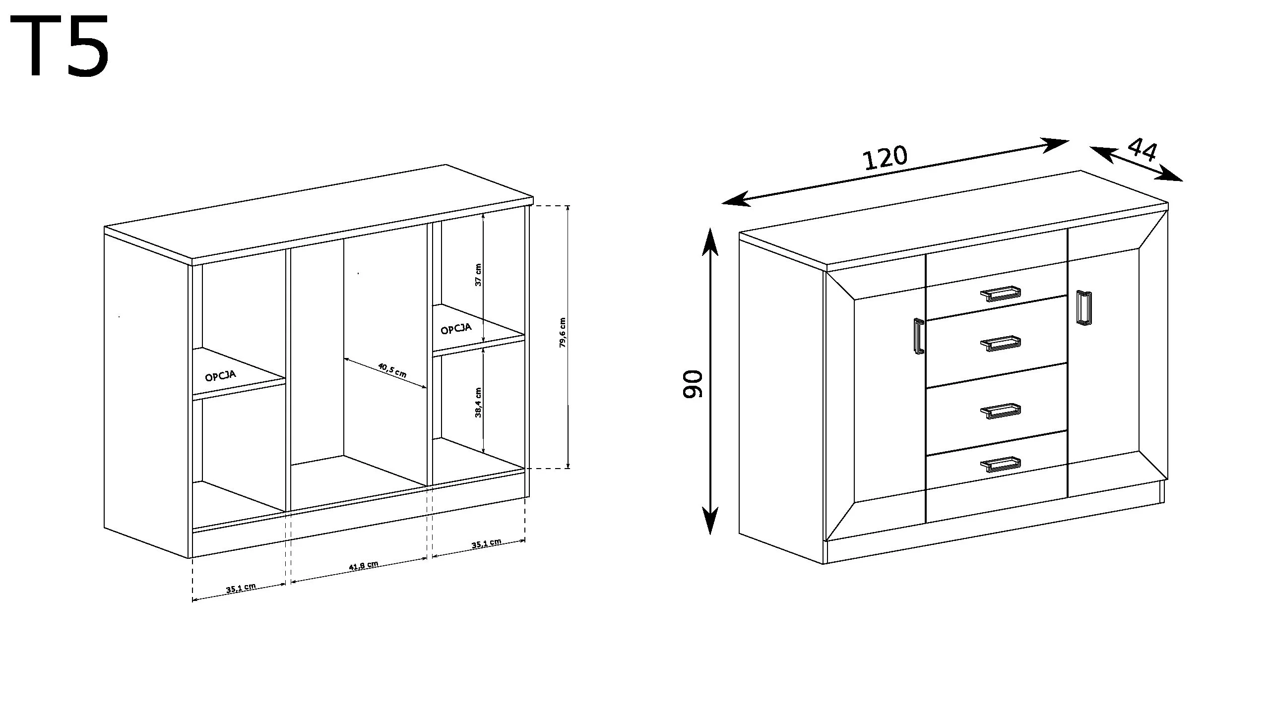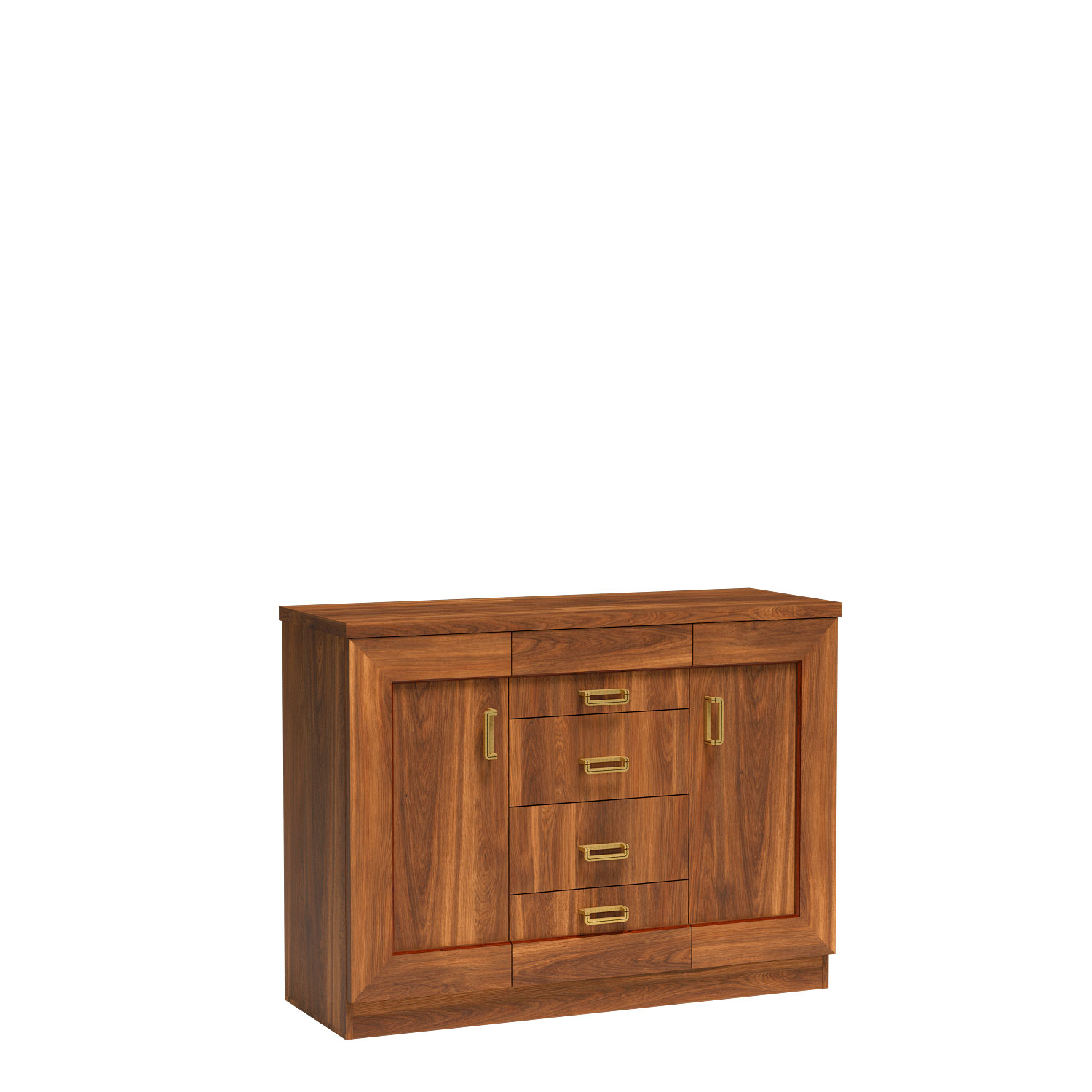 Malá, prostorná komoda se zásuvkami a skříňkami po stranách. Každá skříňka má jednu polici. Komoda má navíc čtyři zásuvky. Všechny čelní strany jsou opatřeny kovovými úchyty, které jí dodávají rustikální nádech.
