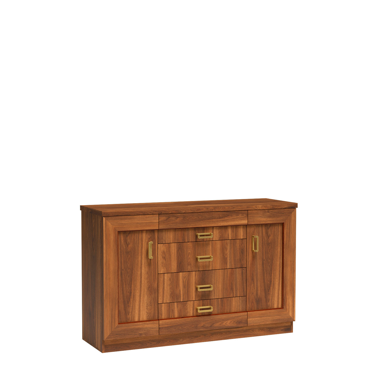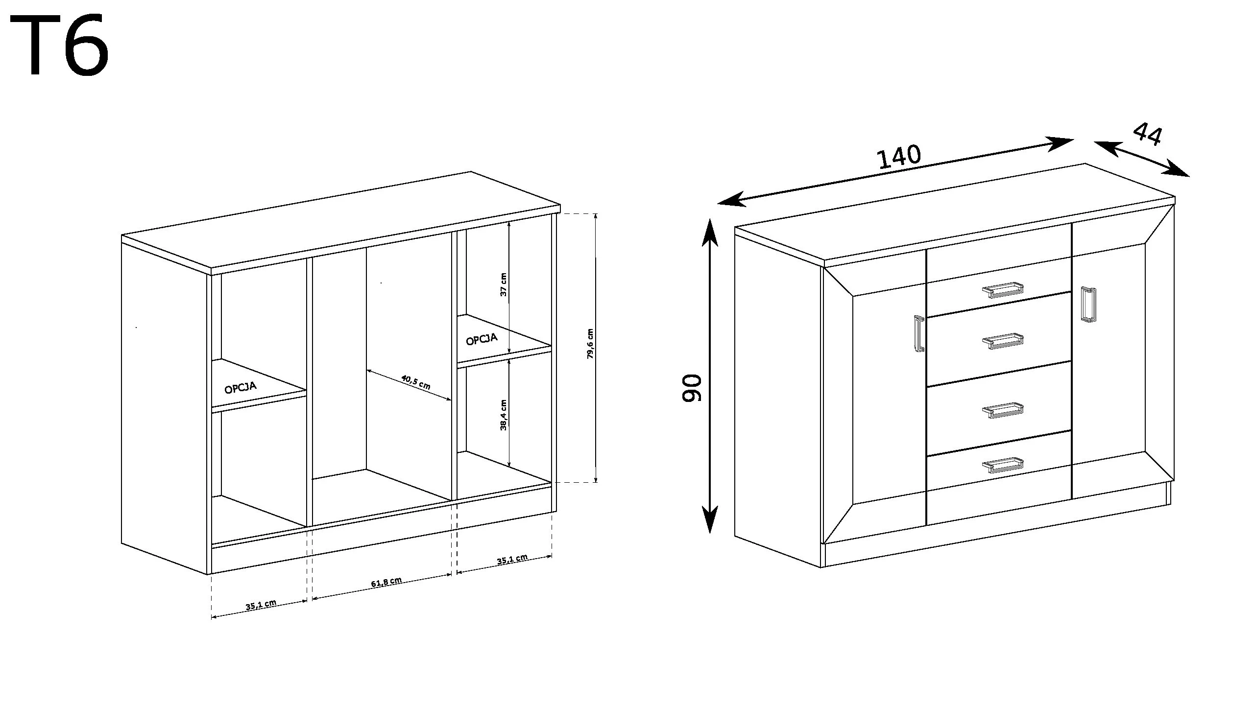 Naše komoda je 100% polský výrobek. Je velká a proto funkční. Má čtyři zásuvky a dvě boční skříňky s policemi. K dispozici ve dvou odstínech dubu.