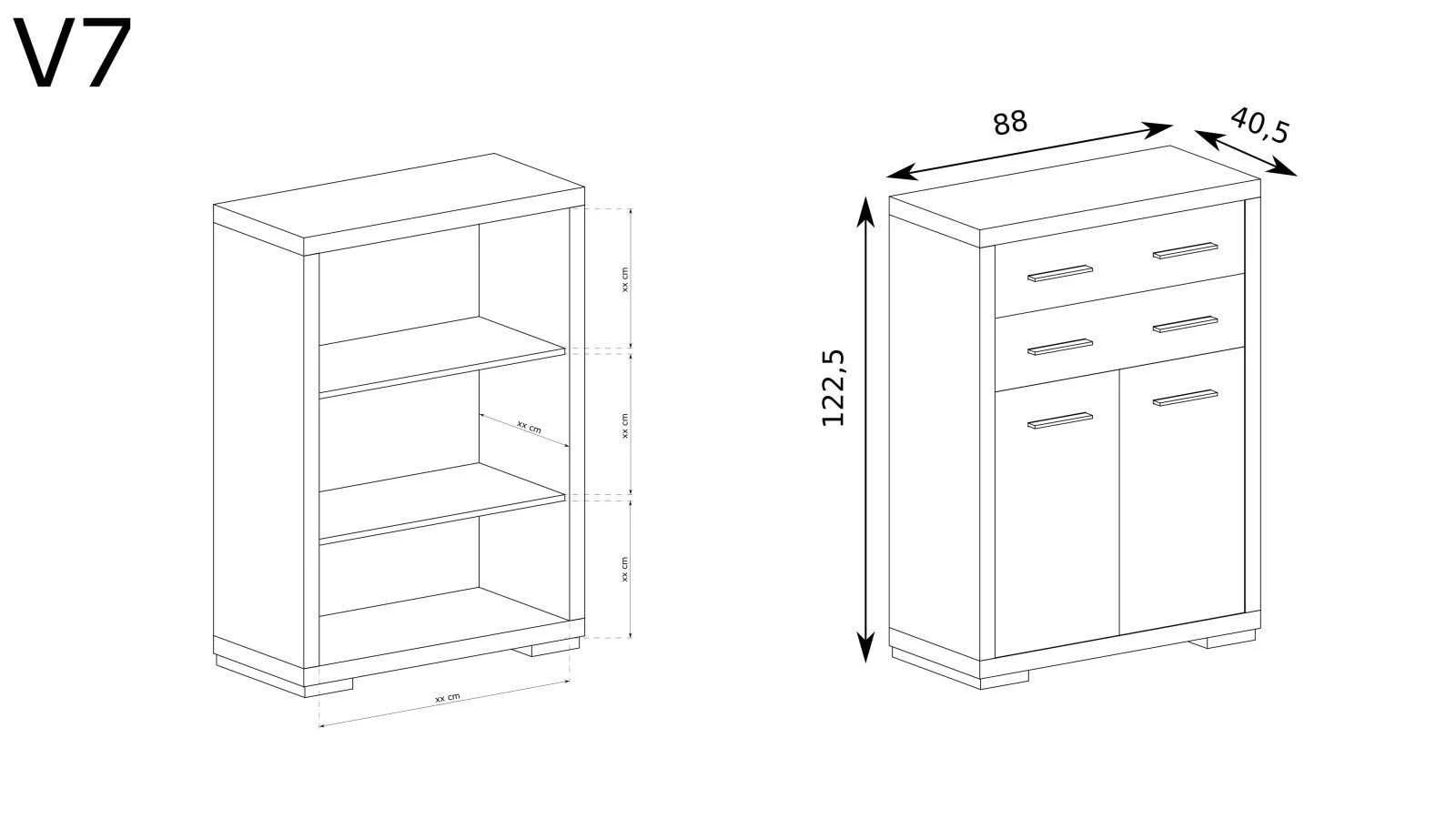 Jednoduchá, vysoká komoda z kolekce Vegas. Disponuje dvěma prostornými zásuvkami, ideálními na oblečení nebo dokumenty. Pod nimi jsou dvoje dvířka, za nimiž se nachází dělicí přepážka a police, což umožňuje dobrou organizaci a uložení velkého množství předmětů. Kovové úchytky umocňují jedinečnost tohoto kusu. Hodí se do obývacích pokojů i kanceláří a umožňuje různé uspořádání. K dispozici ve čtyřech barvách.